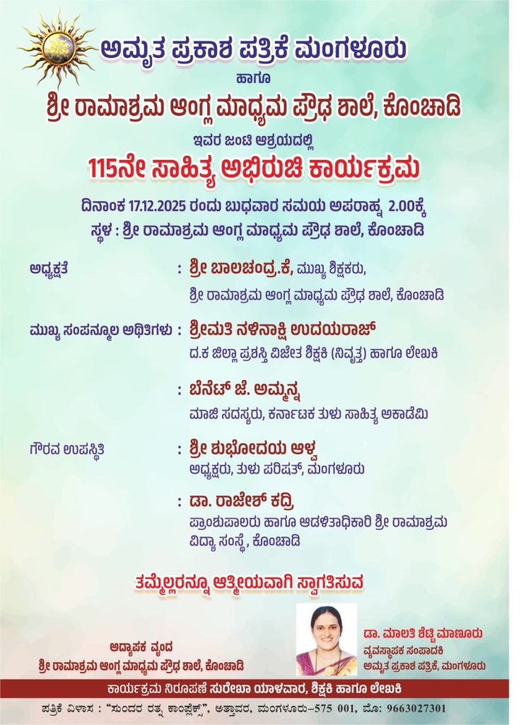 ಮಂಗಳೂರು : ಅಮೃತ ಪ್ರಕಾಶ ಪತ್ರಿಕೆ ಮಂಗಳೂರು ಹಾಗೂ ಶ್ರೀ ರಾಮಾಶ್ರಮ ಆಂಗ್ಲ ಮಾಧ್ಯಮ ಪ್ರೌಢ ಶಾಲೆ ಕೊಂಚಾಡಿ ಇವರ ಜಂಟಿ ಆಶ್ರಯದಲ್ಲಿ 115ನೇ ‘ಸಾಹಿತ್ಯ ಅಭಿರುಚಿ ಕಾರ್ಯಕ್ರಮ’ವನ್ನು ದಿನಾಂಕ 17 ಡಿಸೆಂಬರ್ 2025ರಂದು ಅಪರಾಹ್ನ 02-00 ಗಂಟೆಗೆ ಕೊಂಚಾಡಿ ಶ್ರೀ ರಾಮಾಶ್ರಮ ಆಂಗ್ಲ ಮಾಧ್ಯಮ ಪ್ರೌಢ ಶಾಲೆಯಲ್ಲಿ ಹಮ್ಮಿಕೊಳ್ಳಲಾಗಿದೆ.