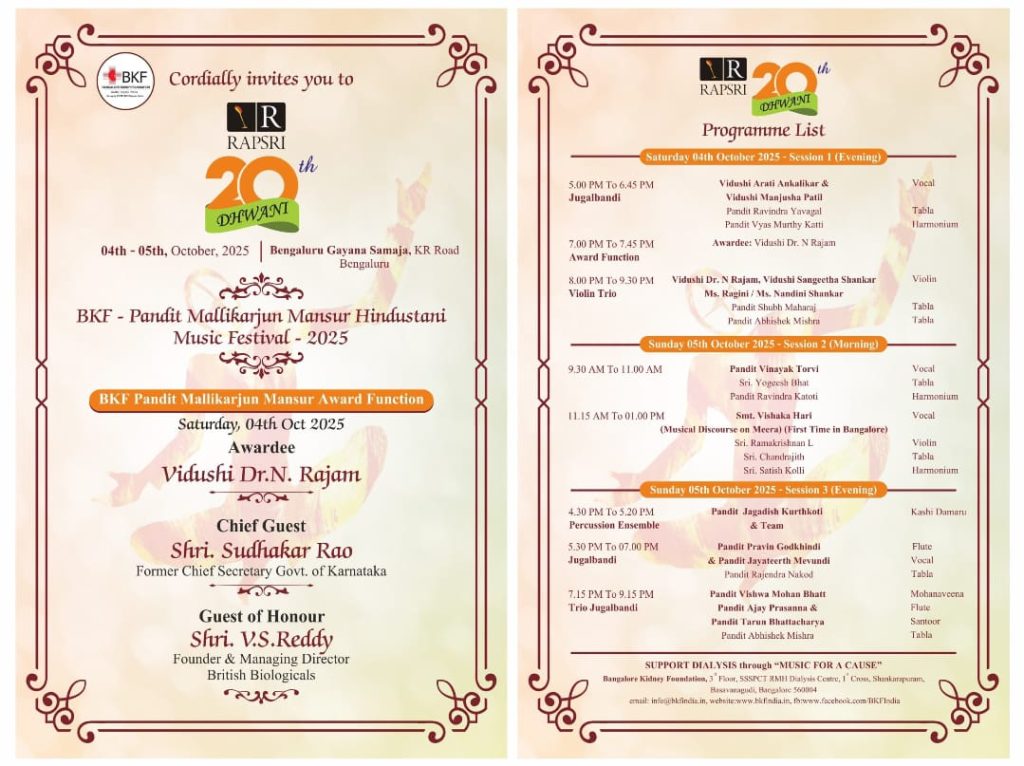 ಬೆಂಗಳೂರು : ಬಿ.ಕೆ.ಎಫ್. ಪ್ರಸ್ತುತ ಪಡಿಸುವ 20ನೇ ‘ಧ್ವನಿ’ ಸಂಗೀತ ಕಾರ್ಯಕ್ರಮವನ್ನು ದಿನಾಂಕ 04 ಮತ್ತು 05 ಅಕ್ಟೋಬರ್ 2025ರಂದು ಬೆಂಗಳೂರು ಕೆ.ಆರ್. ರೋಡಿನಲ್ಲಿರುವ ಬೆಂಗಳೂರು ಗಾಯನ ಸಮಾಜದಲ್ಲಿ ಆಯೋಜಿಸಲಾಗಿದೆ. ಪಂಡಿತ್ ಮಲ್ಲಿಕಾರ್ಜುನ ಮನ್ಸೂರ್ ಹಿಂದೂಸ್ತಾನಿ ಸಂಗೀತ ಉತ್ಸವ -2025 ಮತ್ತು ಪ್ರಶಸ್ತಿ ಪ್ರದಾನ ಸಮಾರಂಭ ನಡೆಯಲಿದೆ.