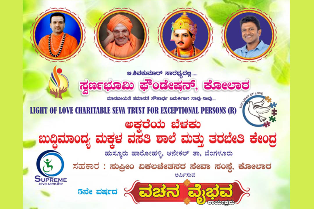 ಬೆಂಗಳೂರು : ಸ್ವರ್ಣಭೂಮಿ ಫೌಂಡೇಷನ್ ಕೋಲಾರ ಮತ್ತು ಅಕ್ಕರೆಯ ಬೆಳಕು ಬುದ್ಧಿಮಾಂದ್ಯ ಮಕ್ಕಳ ವಸತಿ ಶಾಲೆ ಮತ್ತು ತರಬೇತಿ ಕೇಂದ್ರ ಇವರ ವತಿಯಿಂದ ಹಾಗೂ ಸುಪ್ರೀಂ ವಿಕಲಚೇತನದ ಸೇವಾ ಸಂಸ್ಥೆ ಕೋಲಾರ ಇವರ ಸಹಕಾರದೊಂದಿಗೆ ಅರ್ಪಿಸುವ 5ನೇ ವರ್ಷದ ‘ವಚನ ವೈಭವ’ ಮತ್ತು ಪ್ರಶಸ್ತಿ ಪ್ರದಾನ ಕಾರ್ಯಕ್ರಮವನ್ನು ದಿನಾಂಕ 19 ಏಪ್ರಿಲ್ 2026ರಂದು ಮಧ್ಯಾಹ್ನ 2-30 ಗಂಟೆಗೆ ಬೆಂಗಳೂರಿನ ಚಾಮರಾಜಪೇಟೆ ಪಂಪ ಮಹಾಕವಿ ರಸ್ತೆ, ಮಕ್ಕಳಕೂಟ ಹತ್ತಿರ, ಕನ್ನಡ ಸಾಹಿತ್ಯ ಪರಿಷತ್ತು ಕುವೆಂಪು ಸಭಾಂಗಣದಲ್ಲಿ ಹಮ್ಮಿಕೊಳ್ಳಲಾಗಿದೆ.