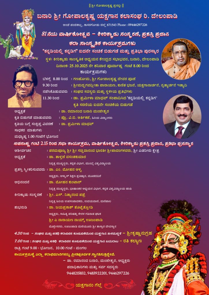 ಕಾಸರಗೋಡು : ಬನಾರಿ ಶ್ರೀ ಗೋಪಾಲಕೃಷ್ಣ ಯಕ್ಷಗಾನ ಕಲಾಸಂಘ (ರಿ.) ದೇಲಂಪಾಡಿ ಇದರ ವತಿಯಿಂದ 81ನೆಯ ವಾರ್ಷಿಕೋತ್ಸವವನ್ನು ದಿನಾಂಕ 25 ಅಕ್ಟೋಬರ್ 2025ರಂದು ಬೆಳಗ್ಗೆ 8-00 ಗಂಟೆಗೆ ದೇಲಂಪಾಡಿ ಬನಾರಿಯ ಕೀರಿಕ್ಕಾಡು ಸಾಂಸ್ಕೃತಿಕ ಅಧ್ಯಯನ ಕೇಂದ್ರದ ಸಭಾಭವನದಲ್ಲಿ ಹಮ್ಮಿಕೊಳ್ಳಲಾಗಿದೆ. ಕೀರಿಕ್ಕಾಡು ಸಂಸ್ಮರಣೆ, ಪ್ರಶಸ್ತಿ ಪ್ರದಾನ, ಕಲಾ ಸಾಂಸ್ಕೃತಿಕ ಕಾರ್ಯಕ್ರಮಗಳು, ‘ಕನ್ನಡಿಯಲ್ಲಿ ಕನ್ನಡಿಗ’ ಐದನೇ ಸಂಚಿಕೆ ಬಿಡುಗಡೆ ಮತ್ತು ಪ್ರತಿಭಾ ಪುರಸ್ಕಾರ ನಡೆಯಲಿದೆ.