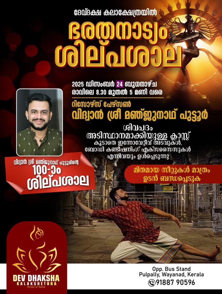 ಕೇರಳ : ಕರಾವಳಿಯ ಯುವ ಭರತನಾಟ್ಯ ಕಲಾವಿದರಾದ ವಿದ್ವಾನ್ ಮಂಜುನಾಥ್ ಎನ್. ಪುತ್ತೂರು ಇವರು ಕೇರಳದ ಪುಲ್ಪಲ್ಲಿ ಎಂಬಲ್ಲಿ ದೇವ್ ದಕ್ಷ ಕಲಾಕ್ಷೇತ್ರ ನೃತ್ಯ ಸಂಸ್ಥೆಯು ದಿನಾಂಕ 24 ಡಿಸೆಂಬರ್ 2025ರಂದು ಬೆಳಗ್ಗೆ 8-30 ಗಂಟೆಗೆ ನಡೆಸುತ್ತಿರುವ ನೃತ್ಯ ಕಾರ್ಯಾಗಾರದಲ್ಲಿ ಸಂಪನ್ಮೂಲ ವ್ಯಕ್ತಿಯಾಗಿ ಭಾಗವಹಿಸಲಿದ್ದಾರೆ.