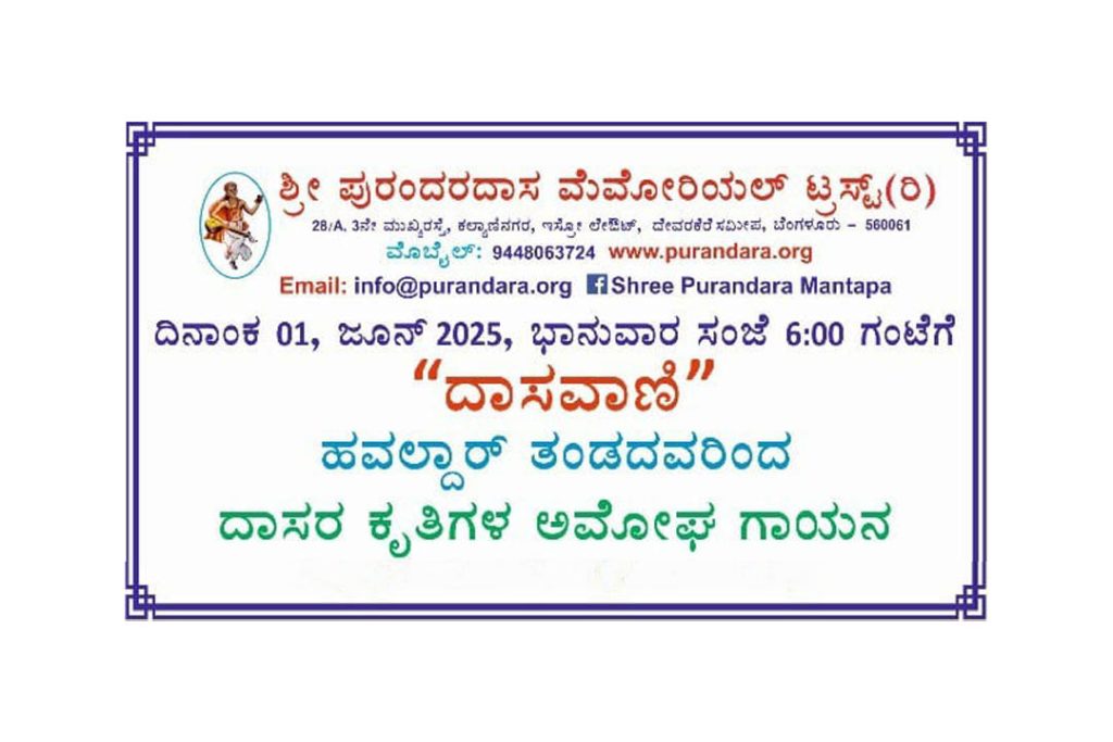 ಬೆಂಗಳೂರು : ಶ್ರೀ ಪುರಂದರದಾಸ ಮೆಮೋರಿಯಲ್ ಟ್ರಸ್ಟ್ (ರಿ.) ಇದರ ವತಿಯಿಂದ ‘ದಾಸವಾಣಿ’ ಹವಲ್ದಾರ್ ತಂಡದವರಿಂದ ದಾಸರ ಕೃತಿಗಳ ಅಮೋಘ ಗಾಯನ (ಹಿಂದೂಸ್ಥಾನಿ ಶೈಲಿಯಲ್ಲಿ) ಕಾರ್ಯಕ್ರಮವನ್ನು ದಿನಾಂಕ 01 ಜೂನ್ 2025ರಂದು ಸಂಜೆ 6-00 ಗಂಟೆಗೆ ಬೆಂಗಳೂರಿನ ದೇವರಕೆರೆ ಇಸ್ರೋ ಲೇಔಟ್ ಹತ್ತಿರ ಪುರಂದರ ಮಂಟಪದಲ್ಲಿ ಹಮ್ಮಿಕೊಳ್ಳಲಾಗಿದೆ.