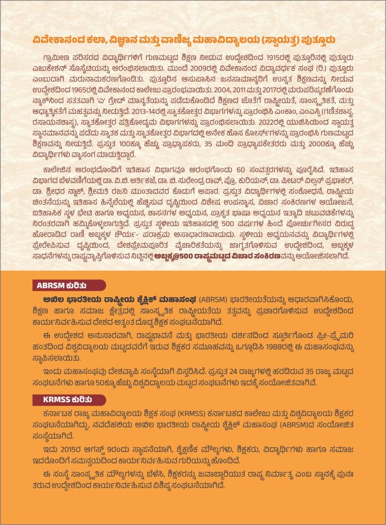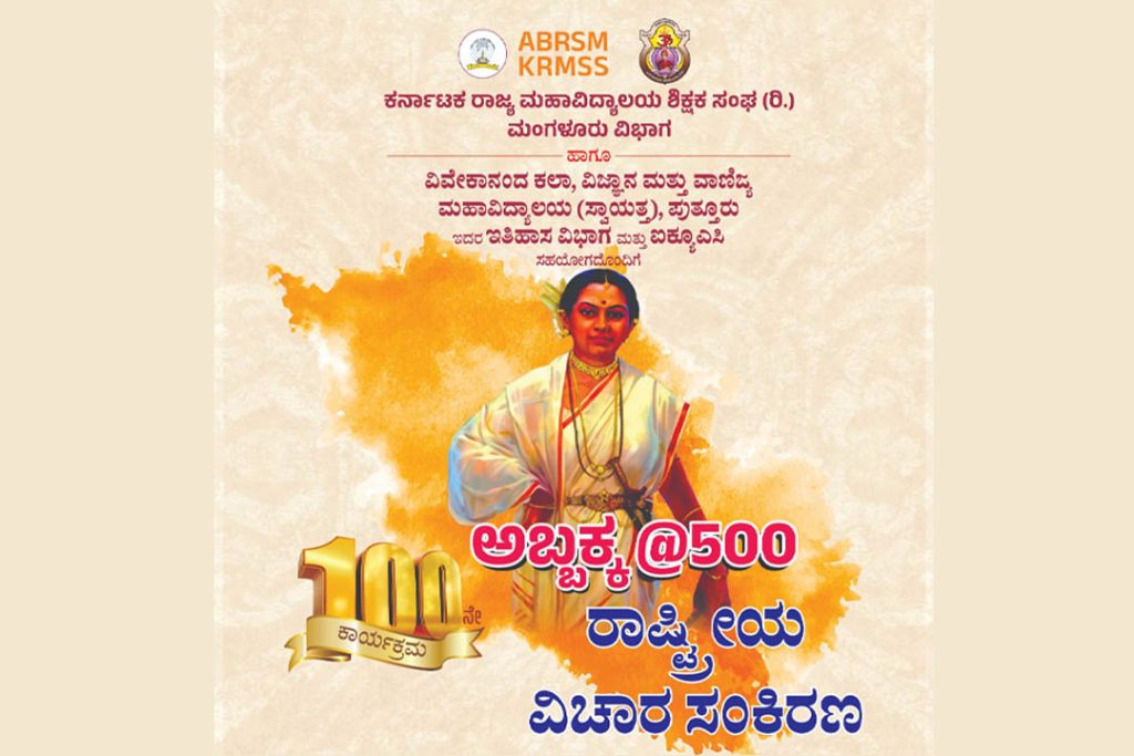 ಕರ್ನಾಟಕ ರಾಜ್ಯ ಮಹಾವಿದ್ಯಾಲಯ ಶಿಕ್ಷಕ ಸಂಘ (ರಿ.) ಮಂಗಳೂರು ವಿಭಾಗ ಹಾಗೂ ವಿವೇಕಾನಂದ ಕಲಾ, ವಿಜ್ಞಾನ ಮತ್ತು ವಾಣಿಜ್ಯ ಮಹಾವಿದ್ಯಾಲಯ (ಸ್ವಾಯತ್ತ) ಪುತ್ತೂರು ಇದರ ಇತಿಹಾಸ ವಿಭಾಗ ಮತ್ತು ಐಕ್ಯೂಎಸಿದ ಸಹಯೋಗದೊಂದಿಗೆ ದಿನಾಂಕ 16 ಫೆಬ್ರವರಿ 2026ರ ಸೋಮವಾರದಂದು ಪುತ್ತೂರು ನೆಹರು ನಗರದ ವಿವೇಕಾನಂದ ಕಾಲೇಜಿನಲ್ಲಿ ಅಬ್ಬಕ್ಕ @500 ರಾಷ್ಟ್ರೀಯ ವಿಚಾರ ಸಂಕೀರ್ಣ ಶತಸಂಭ್ರಮ ಕಾರ್ಯಕ್ರಮ ನಡೆಯಲಿದೆ.