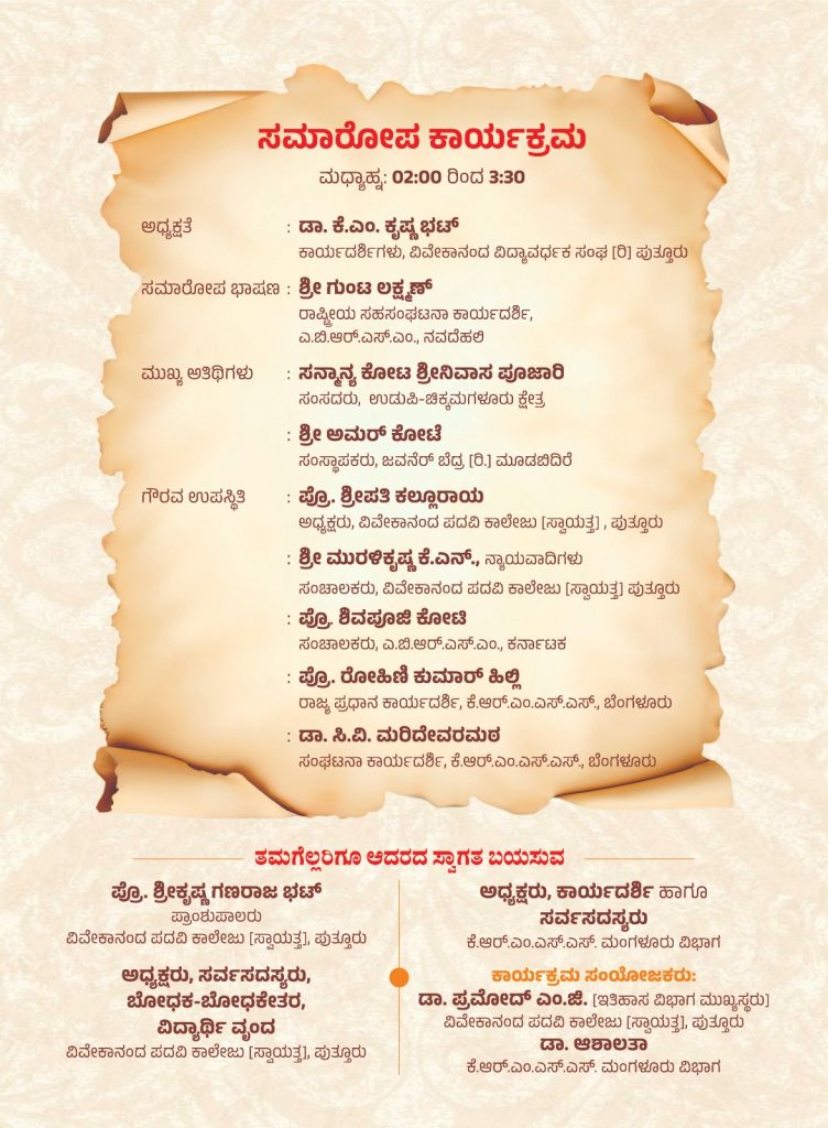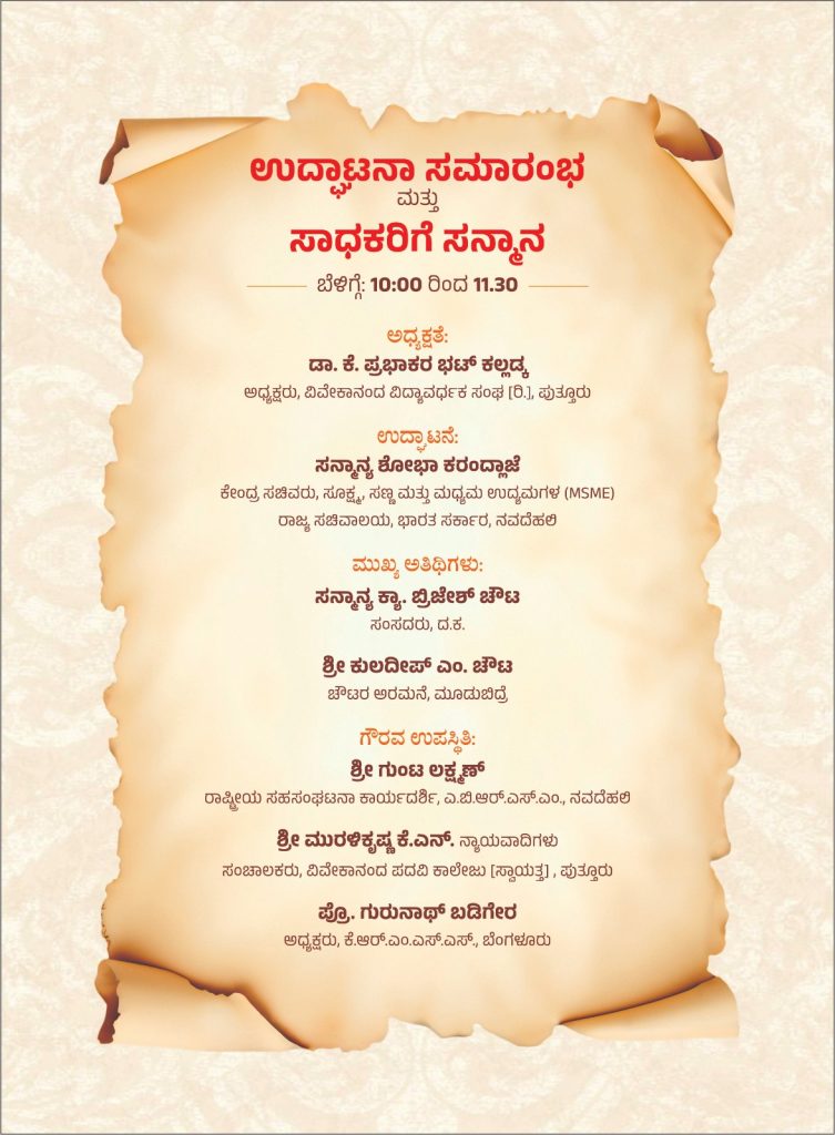 ಕಲ್ಲಡ್ಕ ಪ್ರಭಾಕರ್ ಭಟ್ ಅವರ ಅಧ್ಯಕ್ಷತೆಯಲ್ಲಿ ನಡೆಯುವ ಈ ಕಾರ್ಯಕ್ರಮವನ್ನು ಶೋಭಾ ಕರಂದ್ಲಾಜೆ ಉದ್ಘಾಟಿಸಲಿದ್ದಾರೆ. ಮುಖ್ಯ ಅತಿಥಿಗಳಾಗಿ ಕ್ಯಾಪ್ಟನ್ ಬ್ರಿಜೇಶ್ ಚೌಟ, ಕುಲದೀಪ್ ಎಂ. ಚೌಟ ಹಾಗೆಯೇ ಗುಂಟ ಲಕ್ಷ್ಮಣ್, ಮುರಳಿಕೃಷ್ಣ ಕೆ ಎನ್, ಗುರುನಾಥ್ ಬಡಿಗೇರ ಪಾಲ್ಗೊಳ್ಳಲಿದ್ದಾರೆ.