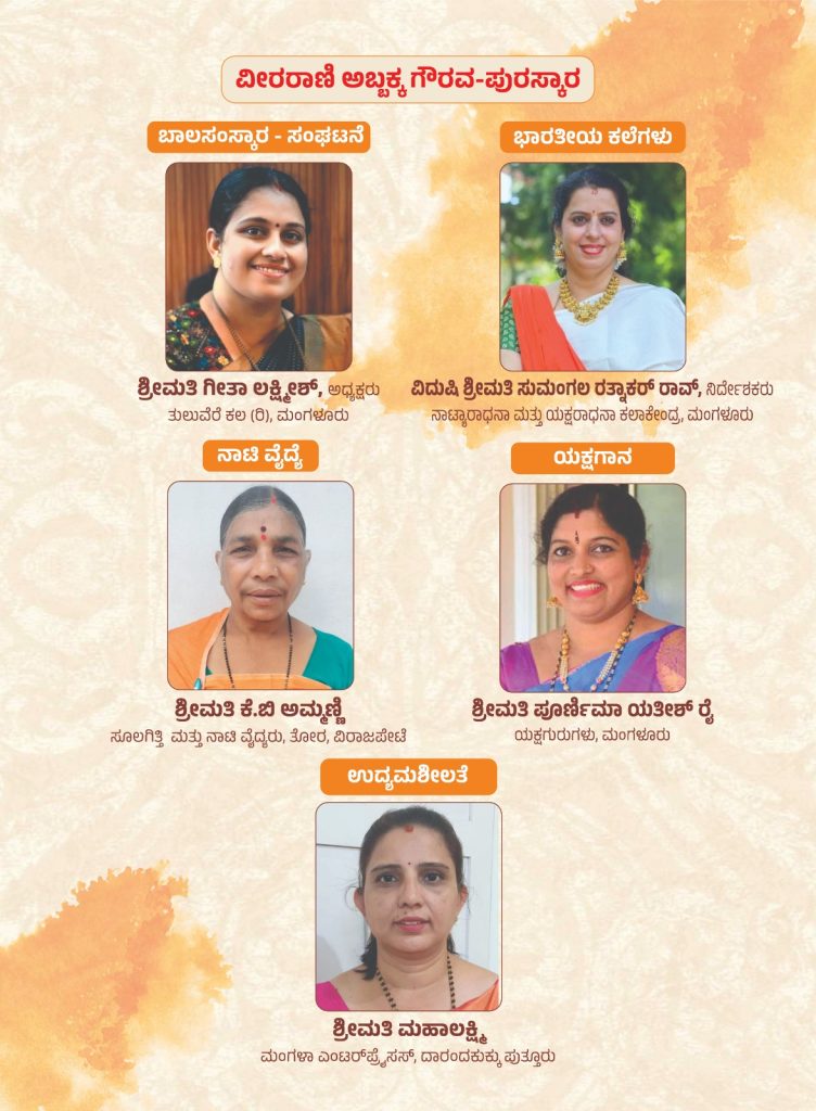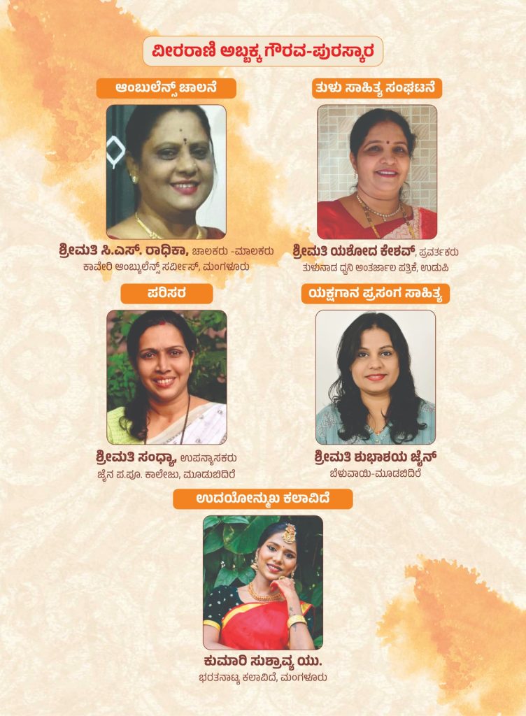 ಈ ಕಾರ್ಯಕ್ರಮದಲ್ಲಿ 21 ಮಹಿಳಾ ಸಾಧಕರಿಗೆ ವೀರ ರಾಣಿ ಅಬ್ಬಕ್ಕ ಗೌರವ ಪುರಸ್ಕಾರ ಪ್ರದಾನ ನಡೆಯಲಿದೆ. ಸುರೇಖಾ ಶೆಟ್ಟಿ (ಮಹಿಳಾ ಸಬಲೀಕರಣ), ಸುಂದರಿ ನಲಿಕೆ ಪೆರುವಾಯಿ (ದೈವಾರಾಧನೆ), ಡಾ. ಆಶಾಜ್ಯೋತಿ ರೈ (ಸಮಾಜಸೇವೆ – ಸಂಘಟನೆ), ವನಜಾ ಪೂಜಾರ್ತಿ ಬೀಡಿನಗುಡ್ಡೆ (ರುದ್ರಭೂಮಿ ಸೇವೆ), ಡಾ. ಗ್ರೀಷ್ಮಾ ವಿವೇಕ್ ಆಳ್ವ (ಪ್ರಕೃತಿ ಚಿಕಿತ್ಸೆ ಮತ್ತು ಸಮಗ್ರ ಸ್ವಾಸ್ಥ್ಯ), ಗೀತಾ ಲಕ್ಷ್ಮೀಶ್ (ಬಾಲ ಸಂಸ್ಕಾರ – ಸಂಘಟನೆ), ವಿದುಷಿ ಸುಮಂಗಲ ರತ್ನಾಕರ್ ರಾವ್ (ಭಾರತೀಯ ಕಲೆಗಳು), ಕೆ.ಬಿ. ಅಮ್ಮಣ್ಣಿ (ನಾಟಿವೈದ್ಯೆ), ಪೂರ್ಣಿಮಾ ಯತೀಶ್ ರೈ (ಯಕ್ಷಗಾನ), ಮಹಾಲಕ್ಷ್ಮೀ ದಾರಂದಕುಕ್ಕು (ಉದ್ಯಮಶೀಲತೆ), ಸಿ.ಎಸ್. ರಾಧಿಕಾ (ಆಂಬುಲೆನ್ಸ್ ಚಾಲನೆ), ಯಶೋಧಾ ಕೇಶವ್ ಉಡುಪಿ (ತುಳು ಸಾಹಿತ್ಯ ಸಂಘಟನೆ), ಸಂಧ್ಯಾ ಮೂಡಬಿದ್ರೆ (ಪರಿಸರ), ಶುಭಾಶಯ ಜೈನ್ (ಯಕ್ಷಗಾನ ಪ್ರಸಂಗ ಸಾಹಿತ್ಯ), ಕುಮಾರಿ ಶ್ರಾವ್ಯ ಯು. (ಉದಯೋನ್ಮುಖ ಕಲಾವಿದೆ), ಭವ್ಯರಾಣಿ ಪಿ.ಸಿ. (ಸಮುದಾಯ ಅಭಿವೃದ್ಧಿ), ರೂಪಲೇಖಾ (ಆಯುರ್ವೇದ), ಶಾಲಿನಿ ಆತ್ಮಭೂಷಣ್ ಪುತ್ತೂರು (ಭರತನಾಟ್ಯ), ಶುಭಾ ಅಡಿಗ ಪುತ್ತೂರು (ತಾಳಮದ್ದಳೆ), ಕುಮಾರಿ ಶಹನಾ ಮುಮ್ತಾಜ್ ನೆಲ್ಯಡ್ಕ (ಪತ್ರಿಕೋದ್ಯಮ), ಕೆ.ಎನ್. ದೀಪಿಕಾ (ಯೋಗ ಮತ್ತು ಧ್ಯಾನ) ಇವರುಗಳು ಗೌರವ ಸನ್ಮಾನವನ್ನು ಪಡೆಯಲಿದ್ದಾರೆ. ಈ 100ನೇ ಕಾರ್ಯಕ್ರಮ ಅತ್ಯುತ್ತಮವಾಗಿ ಮೂಡಿ ಬಂದು ಇನ್ನಷ್ಟು ಇಂತಹ ಒಳ್ಳೆಯ ಕಾರ್ಯಕ್ರಮಗಳಿಗೆ ಪ್ರೇರಣೆಯಾಗಲಿ ಎಂಬುವುದು ನಮ್ಮಯ ಆಶಯ.