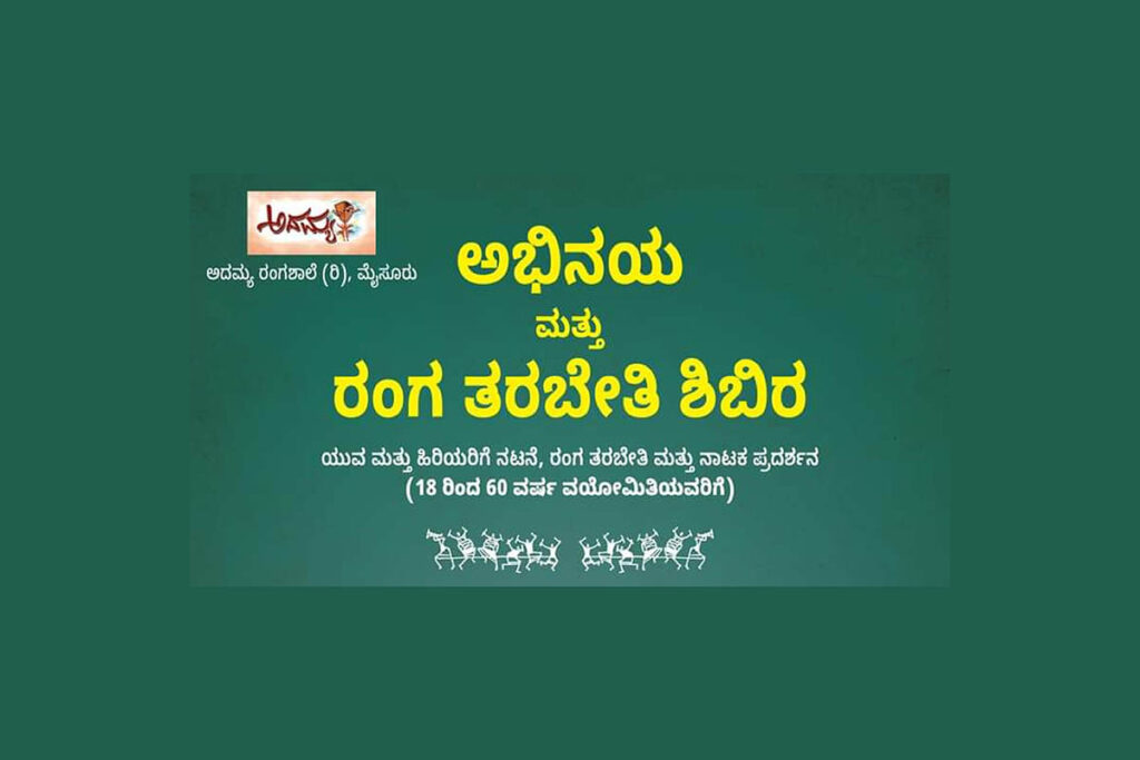 ಮೈಸೂರು: ನಗರದ ರಂಗಭೂಮಿ ಕ್ಷೇತ್ರದಲ್ಲಿ ಸಕ್ರಿಯವಾಗಿ ಗುರುತಿಸಿಕೊಂಡಿರುವ ಅದಮ್ಯ ರಂಗ ಶಾಲೆಯು 30 ದಿನಗಳ ಅವಧಿಯ ರಂಗ ತರಬೇತಿ ಶಿಬಿರ ಆಯೋಜಿಸಿದ್ದು, ಹವ್ಯಾಸಿ ರಂಗಾಸಕ್ತರಿಂದ ಅರ್ಜಿ ಆಹ್ವಾನಿಸಿದೆ.