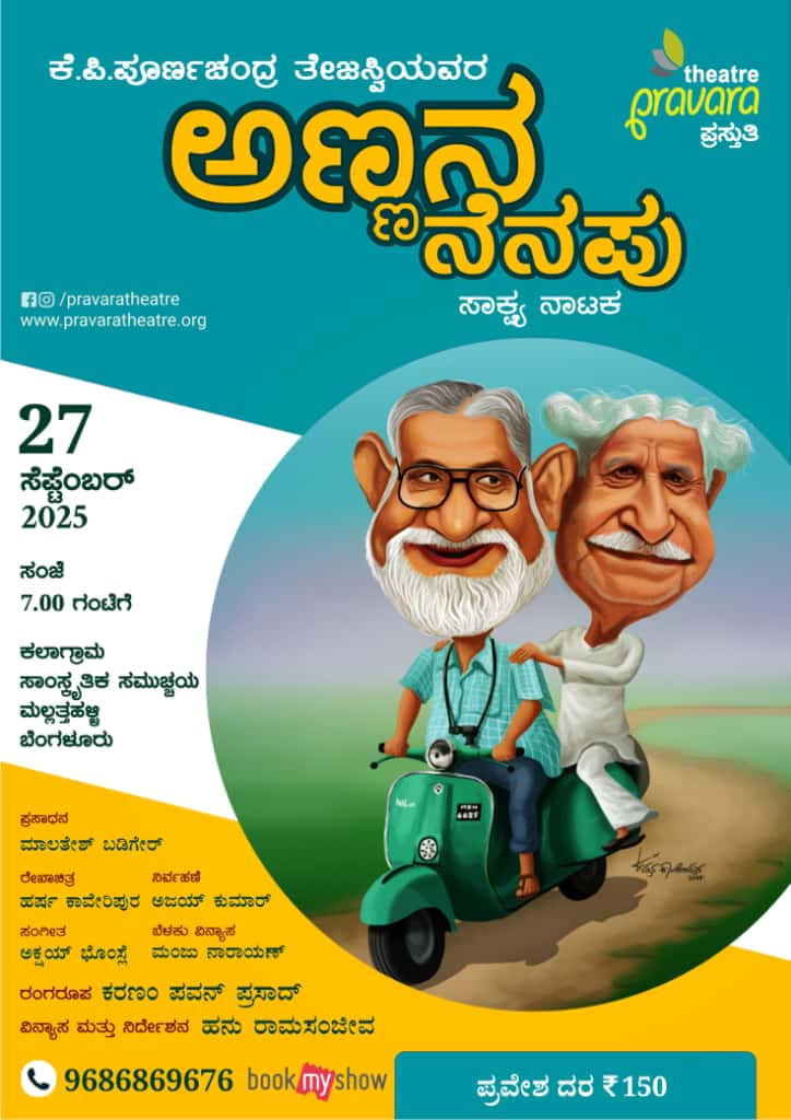 ಬೆಂಗಳೂರು : ಬೆಂಗಳೂರಿನ ಪ್ರವರ ಥಿಯೇಟರ್ ಪ್ರಸ್ತುತ ಪಡಿಸುವ ಕೆ.ಪಿ. ಪೂರ್ಣಚಂದ್ರ ತೇಜಸ್ವಿಯವರ ‘ಅಣ್ಣನ ನೆನಪು’ ಸಾಕ್ಷ್ಯ ನಾಟಕವು ದಿನಾಂಕ 27 ಸೆಪ್ಟೆಂಬರ್ 2025ರಂದು ಸಂಜೆ ಗಂಟೆ 7-00ಕ್ಕೆ ಬೆಂಗಳೂರಿನ ಮಲ್ಲತ್ತಹಳ್ಳಿಯ ಕಲಾಗ್ರಾಮ ಸಾಂಸ್ಕೃತಿಕ ಸಮುಚ್ಚಯದಲ್ಲಿ ಪ್ರದರ್ಶನಗೊಳ್ಳಲಿದೆ.