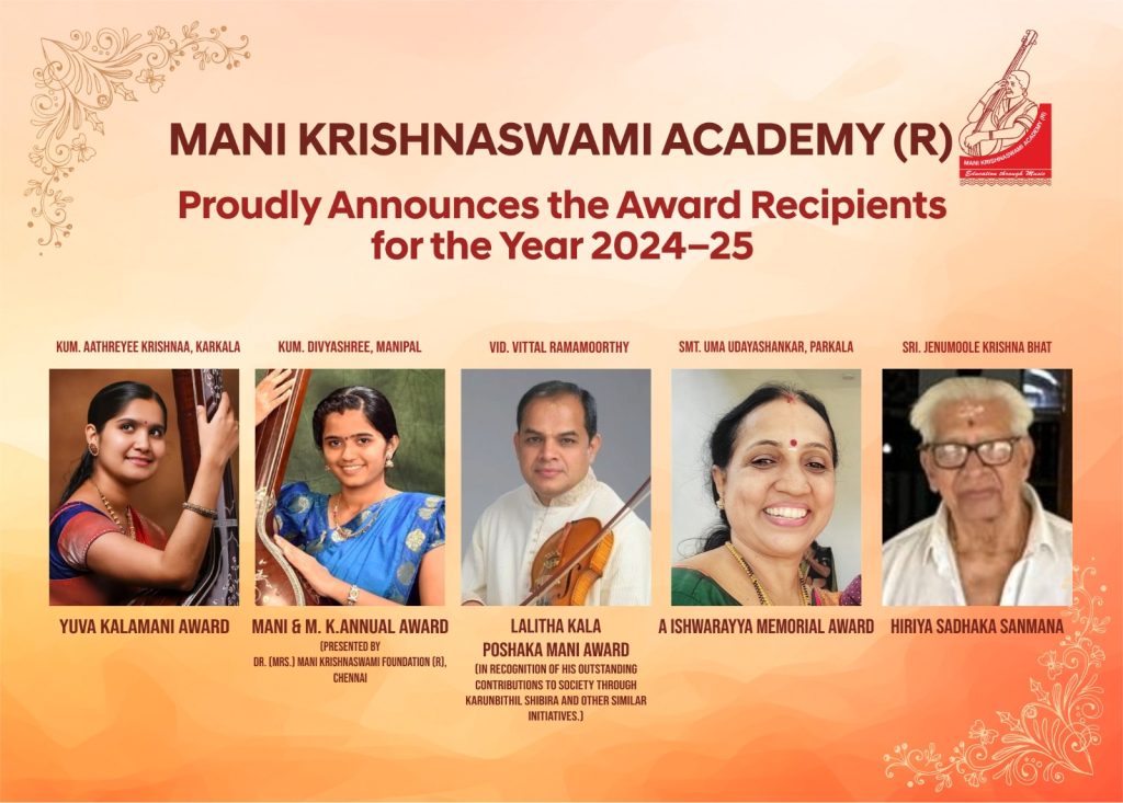 ಮಂಗಳೂರು : ಸುರತ್ಕಲ್‌ನ ಮಣಿ ಕೃಷ್ಣಸ್ವಾಮಿ ಅಕಾಡೆಮಿ ವತಿಯಿಂದ 2024-25ನೇ ಸಾಲಿನ ಪ್ರಶಸ್ತಿಗೆ ಐವರು ಆಯ್ಕೆಯಾಗಿದ್ದಾರೆ. ಆತ್ರೇಯಿ ಕೃಷ್ಣ ಕಾರ್ಕಳ ಇವರು ‘ಯುವ ಕಲಾಮಣಿ’, ದಿವ್ಯಶ್ರೀ ಮಣಿಪಾಲ ಇವರು ‘ಮಣಿ ಮತ್ತು ಎಂ.ಕೆ. ವಾರ್ಷಿಕ ಪ್ರಶಸ್ತಿ’, ವಿದ್ವಾನ್ ವಿಠಲ ರಾಮ ಮೂರ್ತಿ ಇವರು ‘ಲಲಿತ ಕಲಾ ಪೋಷಕ ಮಣಿ ಪ್ರಶಸ್ತಿ’, ಉಮಾ ಉದಯ ಶಂಕ‌ರ್ ಪರ್ಕಳ ಇವರು ‘ಎ.ಈಶ್ವರಯ್ಯ ಸ್ಮಾರಕ ಪ್ರಶಸ್ತಿ’, ಜೇನುಮೂಲೆ ಕೃಷ್ಣ ಭಟ್ ಇವರು ‘ಹಿರಿಯ ಸಾಧಕ ಸನ್ಮಾನ’ಕ್ಕೆ ಆಯ್ಕೆಯಾಗಿದ್ದು, ಇವರುಗಳಿಗೆ ದಿನಾಂಕ 13ರಿಂದ 20 ಡಿಸೆಂಬರ್ 2025ರ ತನಕ ನಡೆಯುವ ‘ರಾಗ ಸುಧಾರಸ ಸಂಗೀತೋತ್ಸವ’ ಸಂದರ್ಭ ಪ್ರಶಸ್ತಿ ವಿತರಿಸಲಾಗುವುದು ಎಂದು ಮಣಿ ಕೃಷ್ಣಸ್ವಾಮಿ ಆಕಾಡೆಮಿಯ ಕಾರ್ಯದರ್ಶಿಯಾದ ನಿತ್ಯಾನಂದ ರಾವ್ ತಿಳಿಸಿದ್ದಾರೆ.
