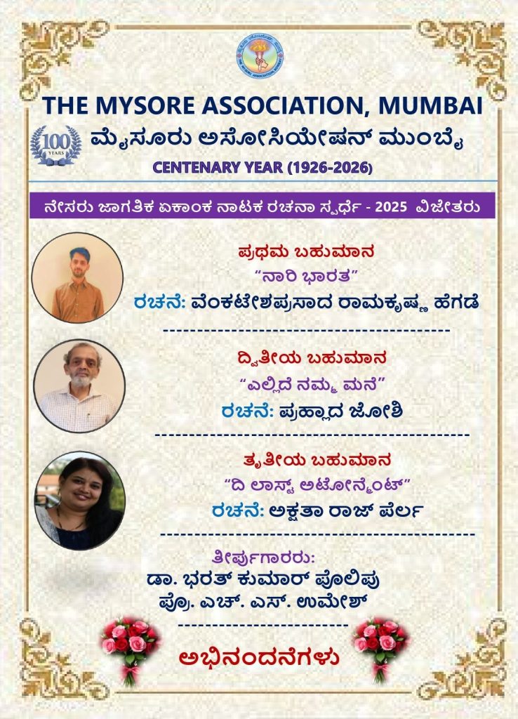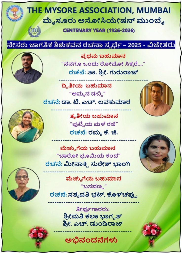 ಮುಂಬೈ : ಮೈಸೂರು ಅಸೋಸಿಯೇಷನ್ ಮುಂಬಯಿಯ ಶತಮಾನೋತ್ಸವದ ಪ್ರಯುಕ್ತ ಆಯೋಜಿಸಿದ ‘ನೇಸರು ಜಾಗತಿಕ ಶಿಶು ಕವನ ರಚನಾ ಸ್ಪರ್ಧೆ -2025’, ‘ನೇಸರು ಜಾಗತಿಕ ಸಣ್ಣ ಕತೆ ಸ್ಪರ್ಧೆ 2025’ ಮತ್ತು ‘ನೇಸರು ಜಾಗತಿಕ ಏಕಾಂಕ ನಾಟಕ ರಚನಾ ಸ್ಪರ್ಧೆ -2025’ಯ ಫಲಿತಾಂಶ ಪ್ರಕಟವಾಗಿದೆ.