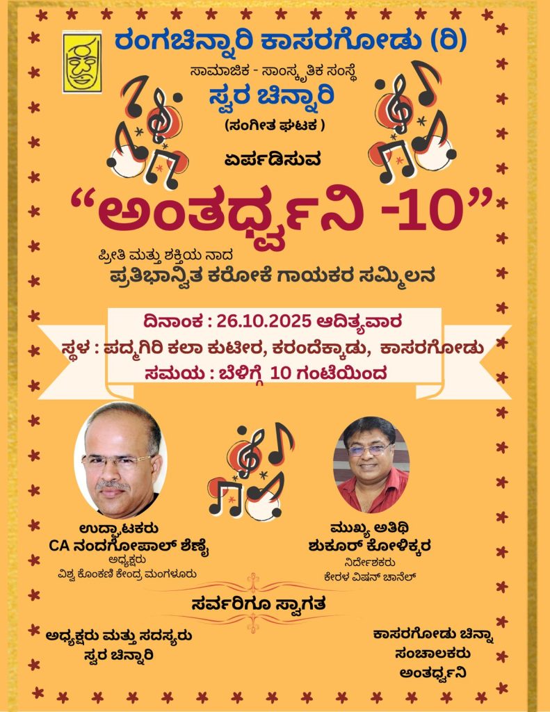 ಕಾಸರಗೋಡು : ಸಾಮಾಜಿಕ ಸಾಂಸ್ಕೃತಿಕ ಸಂಸ್ಥೆ ರಂಗಚಿನ್ನಾರಿ ಕಾಸರಗೋಡು (ರಿ.) ಮತ್ತು ‘ಸ್ವರ ಚಿನ್ನಾರಿ’ (ಸಂಗೀತ ಘಟಕ) ಪ್ರಸ್ತುತ ಪಡಿಸುವ ಪ್ರತಿಭಾನ್ವಿತ ಕರೋಕೆ ಗಾಯಕರ ಸಮ್ಮಿಲನ ‘ಅಂತರ್ಧ್ವನಿ -10’ ಸಂಗೀತ ಕಾರ್ಯಕ್ರಮವನ್ನು ದಿನಾಂಕ 26 ಅಕ್ಟೋಬರ್ 2025ರಂದು ಬೆಳಿಗ್ಗೆ 10-00 ಗಂಟೆಗೆ ಕಾಸರಗೋಡಿನ ಕರೆಂದಕ್ಕಾಡು ಪದ್ಮಗಿರಿ ಕಲಾ ಕುಟೀರದಲ್ಲಿ ಹಮ್ಮಿಕೊಳ್ಳಲಾಗಿದೆ.