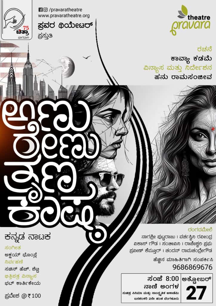ಬೆಂಗಳೂರು : ಪ್ರವರ ಥಿಯೇಟರ್ ಪ್ರಸ್ತುತಪಡಿಸುವ ಹನು ರಾಮಸಂಜೀವ ಇವರ ವಿನ್ಯಾಸ ಮತ್ತು ನಿರ್ದೇಶನದಲ್ಲಿ ‘ಅಣು ರೇಣು ತೃಣ ಕಾಷ್ಠ’ ಕನ್ನಡ ನಾಟಕ ಪ್ರದರ್ಶನವನ್ನು ದಿನಾಂಕ 27 ಅಕ್ಟೋಬರ್ 2025ರಂದು ಸಂಜೆ 8-00 ಗಂಟೆಗೆ ಬೆಂಗಳೂರು ಬನ ಶಂಕರಿ 2 ನೇ ಹಂತ ಸುಚಿತ್ರ ಸಿನಿಮಾ ಮತ್ತು ಸಾಂಸ್ಕೃತಿಕ ಅಕಾಡೆಮಿಯ ನಾಣಿ ಅಂಗಳದಲ್ಲಿ ಆಯೋಜಿಸಲಾಗಿದೆ.