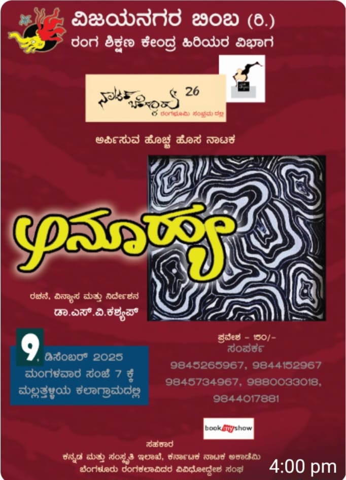 ಬೆಂಗಳೂರು : ವಿಜಯನಗರ ಬಿಂಬ (ರಿ.) ಇದರ ರಂಗ ಶಿಕ್ಷಣ ಕೇಂದ್ರ ಹಿರಿಯರ ವಿಭಾಗದ ವತಿಯಿಂದ ‘ಅನೂಹ್ಯ’ ಹೊಚ್ಚ ಹೊಸ ನಾಟಕ ಪ್ರದರ್ಶನವನ್ನು ದಿನಾಂಕ 09 ಡಿಸೆಂಬರ್ 2025ರಂದು ಸಂಜೆ 7-00 ಗಂಟೆಗೆ ಬೆಂಗಳೂರಿನ ಮಲ್ಲತ್ತಹಳ್ಳಿಯ ಕಲಾಗ್ರಾಮದಲ್ಲಿ ಆಯೋಜಿಸಲಾಗಿದೆ. ಈ ನಾಟಕವನ್ನು ಡಾ. ಎಸ್.ವಿ. ಕಶ್ಯಪ್ ಇವರು ರಚನೆ, ವಿನ್ಯಾಸ ಮತ್ತು ನಿರ್ದೇಶನ ಮಾಡಿರುತ್ತಾರೆ. ಹೆಚ್ಚಿನ ಮಾಹಿತಿಗಾಗಿ 9845265967, 9844152967, 9845734967, 9880033018 ಮತ್ತು 9844017881 ಸಂಖ್ಯೆಯನ್ನು ಸಂಪರ್ಕಿಸಿರಿ.