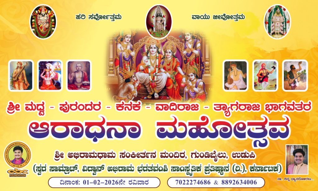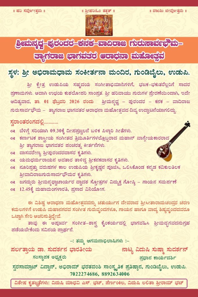 ಉಡುಪಿ : ಸ್ವರ ಸಾಮ್ರಾಟ್ ವಿದ್ವಾನ್ ಅಭಿರಾಮ ಭರತವಂಶಿ ಸಾಂಸ್ಕೃತಿಕ ಪ್ರತಿಷ್ಠಾನ (ರಿ.) ಕರ್ನಾಟಕ ಇದರ ವತಿಯಿಂದ ಶ್ರೀ ಮದ್ವ ಪುರಂದರ ಕನಕ ವಾದಿರಾಜ ತ್ಯಾಗರಾಜ ಭಾಗವತರ ‘ಆರಾಧನಾ ಮಹೋತ್ಸವ’ವನ್ನು ದಿನಾಂಕ 01 ಫೆಬ್ರುವರಿ 2026ರಂದು ಉಡುಪಿ ಗುಂಡಿಬೈಲು ಇಲ್ಲಿರುವ ಶ್ರೀ ಅಭಿರಾಮಧಾಮ ಸಂಕೀರ್ತನ ಮಂದಿರದಲ್ಲಿ ಹಮ್ಮಿಕೊಳ್ಳಲಾಗಿದೆ.