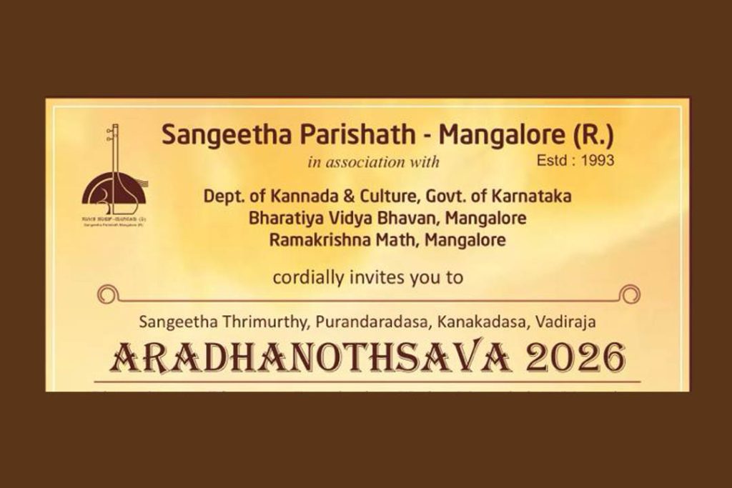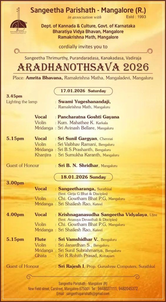 ಮಂಗಳೂರು : ಸಂಗೀತ ಪರಿಷತ್ ಮಂಗಳೂರು ಇದರ ವತಿಯಿಂದ ಕರ್ನಾಟಕ ಸರ್ಕಾರದ ಕನ್ನಡ ಮತ್ತು ಸಂಸ್ಕೃತಿ ಇಲಾಖೆ, ಭಾರತೀಯ ವಿದ್ಯಾಭವನ ಮಂಗಳೂರು ಮತ್ತು ರಾಮಕೃಷ್ಣ ಮಠ ಇವುಗಳ ಸಹಯೋಗದೊಂದಿಗೆ ಪ್ರಸ್ತುತ ಪಡಿಸುವ ಸಂಗೀತ ತ್ರಿಮೂರ್ತಿಗಳಾದ ಪುರಂದರದಾಸ, ಕನಕದಾಸ ಮತ್ತು ವಾದಿರಾಜರ ‘ಆರಾಧನೋತ್ಸವ 2026’ ಕಾರ್ಯಕ್ರಮವನ್ನು ದಿನಾಂಕ 17 ಮತ್ತು 18 ಜನವರಿ 2026ರಂದು ಮಂಗಳೂರಿನ ರಾಮಕೃಷ್ಣ ಮಠದ ಅಮೃತ ಭವನದಲ್ಲಿ ಹಮ್ಮಿಕೊಳ್ಳಲಾಗಿದೆ.