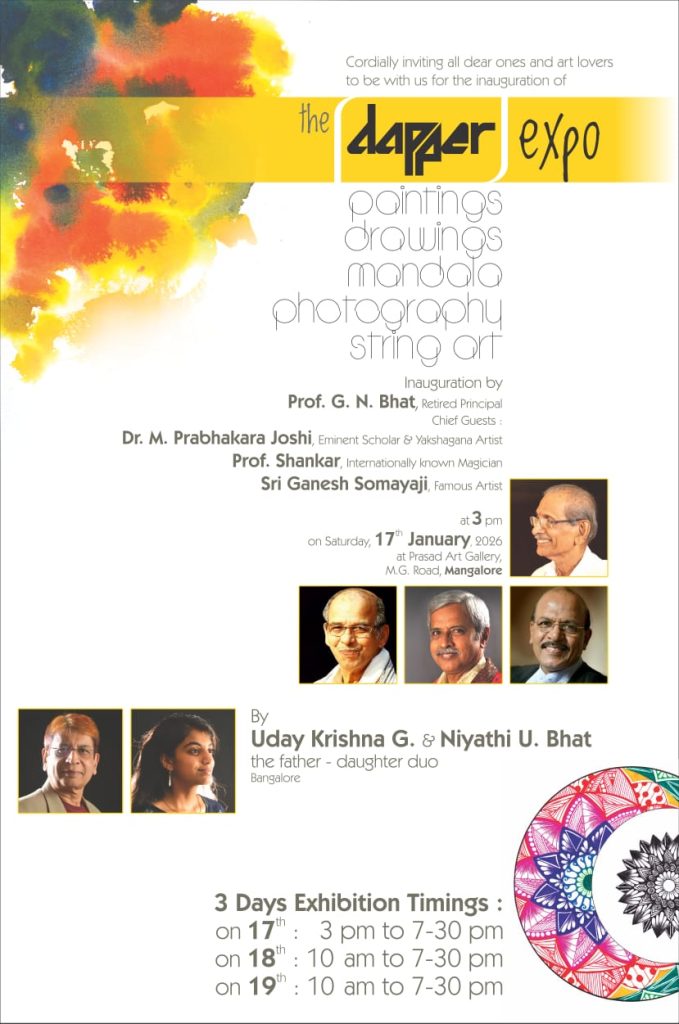 ಮಂಗಳೂರು : ‘ದಿ ಡ್ಯಾಪರ್ ಎಕ್ಸ್ಪೋ’ ಪೇಂಟಿಂಗ್, ಚಿತ್ರಕಲೆ, ಮಂಡಲ, ಸ್ಟ್ರಿಂಗ್ ಆರ್ಟ್, ಛಾಯಾಚಿತ್ರಗಳ ಪ್ರದರ್ಶನದ ಉದ್ಘಾಟನೆಯು ಮಂಗಳೂರು ಎಂ.ಜಿ. ರೋಡ್ ನಲ್ಲಿರುವ ಪ್ರಸಾದ್ ಆರ್ಟ್ ಗ್ಯಾಲರಿಯಲ್ಲಿ ದಿನಾಂಕ 17 ಜನವರಿ 2025ರಂದು 3-00 ಗಂಟೆಗೆ ನಡೆಯಲಿದೆ. 18 ಮತ್ತು 19 ಜನವರಿ 2025ರಂದು ಕಲಾ ಪ್ರದರ್ಶನವನ್ನು ಆಯೋಜಿಸಲಾಗಿದೆ.