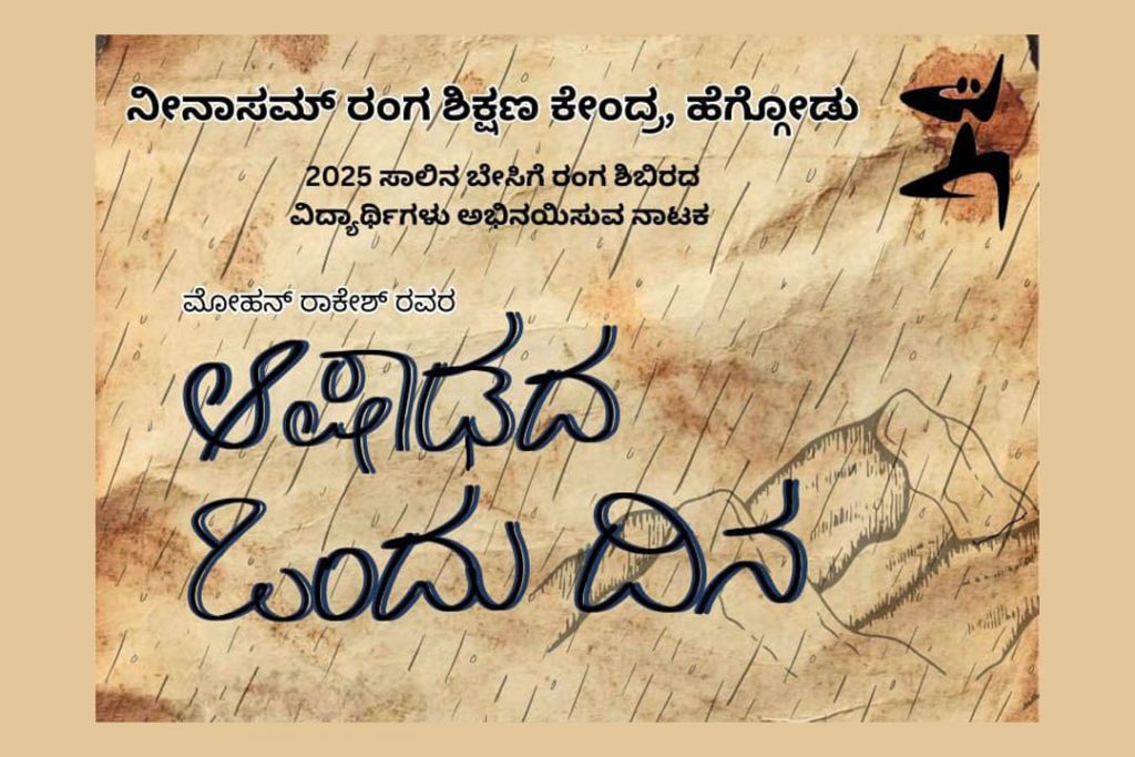 ಹೆಗ್ಗೋಡು : ನೀನಾಸಮ್ ರಂಗ ಶಿಕ್ಷಣ ಕೇಂದ್ರ ಹೆಗ್ಗೋಡು ಇದರ 2025ನೇ ಸಾಲಿನ ಬೇಸಿಗೆ ರಂಗ ಶಿಬಿರದ ವಿದ್ಯಾರ್ಥಿಗಳು ಅರ್ಪಿಸುವ ಮೋಹನ್ ರಾಕೇಶ್ ಇವರ ‘ಆಷಾಢದ ಒಂದು ದಿನ’ ನಾಟಕ ಪ್ರದರ್ಶನವನ್ನು ದಿನಾಂಕ 31 ಮೇ 2025ರಂದು ಸಂಜೆ 7-00 ಗಂಟೆಗೆ ನೀನಾಸಮ್ ಸಭಾಭವನ ಮತ್ತು ಶಿವರಾಮ ಕಾರಂತ ರಂಗ ಮಂದಿರದಲ್ಲಿ ಹಮ್ಮಿಕೊಳ್ಳಲಾಗಿದೆ. ತಂಡ 1ಕ್ಕೆ ಶ್ವೇತ ಶ್ರೀನಿವಾಸ್ ಮತ್ತು ತಂಡ 2ಕ್ಕೆ ಅಜಯ್ ನೀನಾಸಮ್ ಇವರು ವಿನ್ಯಾಸ ಮತ್ತು ನಿರ್ದೇಶನ ಮಾಡಿರುತ್ತಾರೆ.