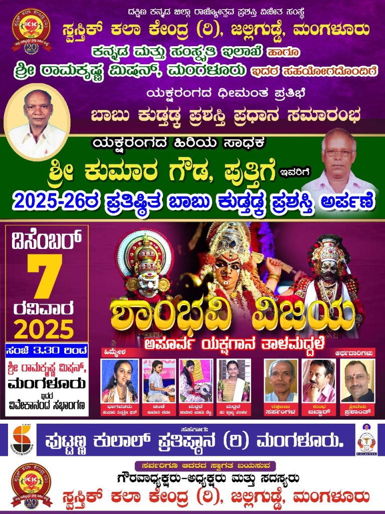 ಮಂಗಳೂರು : ದಕ್ಷಿಣ ಕನ್ನಡ ಜಿಲ್ಲಾ ರಾಜ್ಯೋತ್ಸವ ಪ್ರಶಸ್ತಿ ವಿಜೇತ ಸಂಸ್ಥೆ ಸ್ವಸ್ತಿಕ್ ಕಲಾ ಕೇಂದ್ರ (ರಿ.) ಜಲ್ಲಿಗುಡ್ಡೆ ಮಂಗಳೂರು ಇವರ ವತಿಯಿಂದ ಮತ್ತು ಪುಟ್ಟಣ್ಣ ಕುಲಾಲ್ ಪ್ರತಿಷ್ಠಾನ (ರಿ.) ಪಡೀಲ್ ಇವರ ಸಹಭಾಗಿತ್ವದಲ್ಲಿ ಹಾಗೂ ಕನ್ನಡ ಮತ್ತು ಸಂಸ್ಕೃತಿ ಇಲಾಖೆ ಹಾಗೂ ಶ್ರೀ ರಾಮಕೃಷ್ಣ ಮಿಷನ್ ಮಂಗಳೂರು ಇವರ ಸಹಯೋಗದೊಂದಿಗೆ ಯಕ್ಷರಂಗದ ಧೀಮಂತ ಪ್ರತಿಭೆ ‘ದಿ. ಬಾಬು ಕುಡ್ತಡ್ಕ ಪ್ರಶಸ್ತಿ’ ಪ್ರದಾನ ಸಮಾರಂಭವನ್ನು ದಿನಾಂಕ 07 ಡಿಸೆಂಬರ್ 2025ರಂದು ಸಂಜೆ 3-30 ಗಂಟೆಗೆ ಮಂಗಳೂರಿನ ಶ್ರೀ ರಾಮಕೃಷ್ಣ ಮಠದ ವಿವೇಕಾನಂದ ಸಭಾಂಗಣದಲ್ಲಿ ಹಮ್ಮಿಕೊಳ್ಳಲಾಗಿದೆ. ಜಲ್ಲಿಗುಡ್ಡೆ ಸ್ವಸ್ತಿಕ್ ಕಲಾ ಕೇಂದ್ರ ವತಿಯಿಂದ ನೀಡಲಾಗುವ 2025-26ನೇ ಸಾಲಿನ ಪ್ರತಿಷ್ಠಿತ ಬಾಬು ಕುಡ್ತಡ್ಕ ಪ್ರಶಸ್ತಿಗೆ ಹಿರಿಯ ಯಕ್ಷಗಾನ ಕಲಾವಿದ ಪುತ್ತಿಗೆ ಕುಮಾರ ಗೌಡ ಇವರನ್ನು ಆಯ್ಕೆ ಮಾಡಲಾಗಿದೆ.