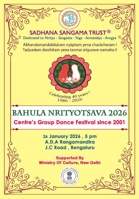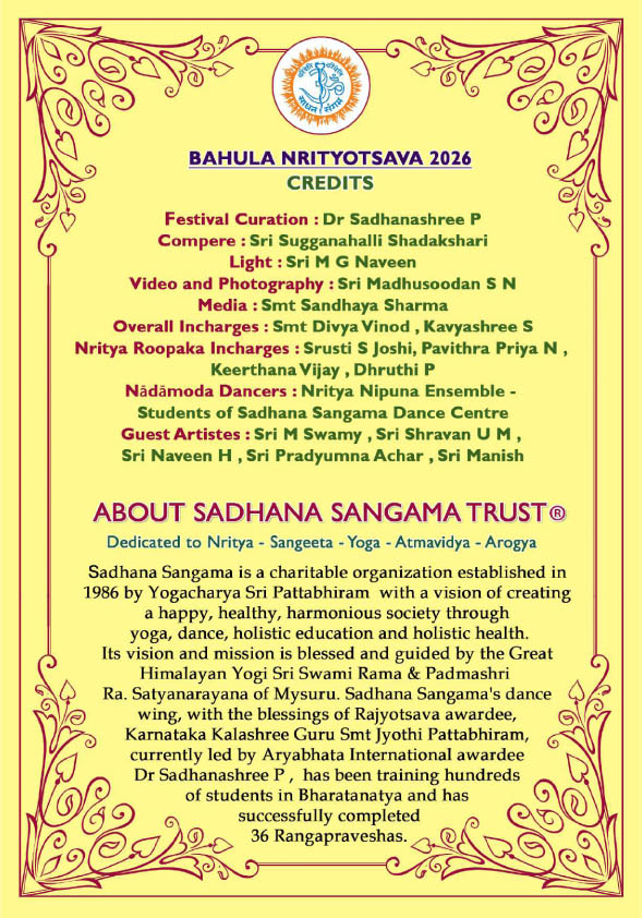 ನಾಟ್ಯಗುರು ಜ್ಯೋತಿ ಪಟ್ಟಾಭಿರಾಮ್ ಮತ್ತು ಅವರ ಶಿಷ್ಯೆ ಮತ್ತು ಮಗಳಾದ ಡಾ. ಪಿ. ಸಾಧನಶ್ರೀ ನೇತೃತ್ವದಲ್ಲಿ ‘ಸಾಧನ ಸಂಗಮ ಟ್ರಸ್ಟ್’ ನೃತ್ಯಶಾಲೆಯು ಪ್ರತಿವರ್ಷದಂತೆ ‘ಬಹುಳ ನೃತ್ಯೋತ್ಸವ’ವನ್ನು ದಿನಾಂಕ 26 ಜನವರಿ 2026ರ ಸೋಮವಾರ ಸಂಜೆ 5-00 ಗಂಟೆಗೆ ಬೆಂಗಳೂರಿನ ಜೆ.ಸಿ. ರಸ್ತೆಯಲ್ಲಿರುವ ಎ.ಡಿ.ಎ. ರಂಗಮಂದಿರದಲ್ಲಿ ಏರ್ಪಡಿಸಿದೆ. ಸ್ವಾಗತ ನರ್ತನ- ಭಾರತೀಯ ವಿವಿಧ ಶಾಸ್ತ್ರೀಯ ನೃತ್ಯಶೈಲಿಗಳ ಪ್ರದರ್ಶನವನ್ನು ‘ನಾಟ್ಯ ದೇಗುಲ ಡ್ಯಾನ್ಸ್ ಸ್ಕೂಲ್’ ಕಲಾತ್ಮಕ ನಿರ್ದೇಶಕ ವಿ.ಎಂ. ಸ್ವಾಮಿಯವರ ಶಿಷ್ಯರಿಂದ ಮತ್ತು ‘ಬಹುಳ’ ನೃತ್ಯರೂಪಕದ ಪ್ರದರ್ಶನವಾಗಿ ‘ದಿ ಸ್ಟ್ರಕ್ಚರಲ್ ಸ್ಕೂಲ್ ಆಫ್ ಫೈನ್ ಆರ್ಟ್ಸ್’ ನ ನಾಟ್ಯಗುರು ವಿದುಷಿ ಅಕ್ಷರ ಭಾರಧ್ವಾಜ್ ಶಿಷ್ಯರು ಪ್ರದರ್ಶಿಸುವ – ‘ರಸ ರಾಜ’ – ವಿಶೇಷ ನೃತ್ಯರೂಪಕ ಹಾಗೂ ‘ಸಾಧನ ಸಂಗಮ ಡ್ಯಾನ್ಸ್ ಸೆಂಟರ್’ ನ ಶಿಷ್ಯರು ಪ್ರದರ್ಶಿಸುವ ‘ನಾದಾಮೋದ’ ಸಂಗೀತ ನೃತ್ಯರೂಪಕಗಳ ವಿಶೇಷ ನೃತ್ಯ ಕಾರ್ಯಕ್ರಮಗಳು ‘ಸಾಧನ ಸಂಗಮ’ದ ‘ಬಹುಳ’ ನೃತ್ಯೋತ್ಸವದ ಅಂಗವಾಗಿ ಮನರಂಜಿಸಲಿವೆ. ಕಣ್ಮನ ತುಂಬುವ ಈ ಕಲಾ ವೈಭವದ ಹೃದಯಸ್ಪರ್ಶಿ ಅನುಭವವನ್ನು ಪಡೆಯಲು ನಾಡಿನ ಎಲ್ಲ ಕಲಾರಸಿಕರಿಗೂ ಆದರದ ಸುಸ್ವಾಗತ.