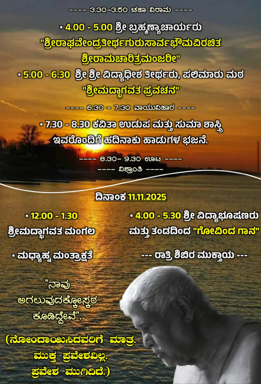 ಪ್ರತಿದಿನ ಬೆಳಿಗ್ಗೆ 08-00 ಗಂಟೆಗೆ ಕಾರ್ಯಕ್ರಮ ಪ್ರಾರಂಭವಾಗಲಿದ್ದು, ಸತ್ಸಂಗ, ಭಜನೆ, ಮಂತ್ರ ಮತ್ತು ಉಪನ್ಯಾಸ ನಡೆಯಲಿದೆ. ಡಾ. ಪ್ರತೋಷ ಏ.ಪಿ. ಇವರಿಂದ ‘ಮಧ್ವಸಿದ್ಧಾಂತ ವಿಜ್ಞಾನ ಬನ್ನಂಜೆ’, ಡಾ. ಗುರುರಾಜ ಕರ್ಜಗಿ ಇವರಿಂದ ದಿನಕ್ಕೊಂದು ಬನ್ನಂಜೆಯವರ ಕೃತಿ ಪರಿಚಯ ಮತ್ತು ಅಭಿಪ್ರಾಯ’, ವಿಜಯ ಸಿಂಹ ಆಚಾರ್ಯರು ‘ಆಚಾರ್ಯರ ಸರ್ವಮೂಲ ಗ್ರಂಥ’, ವಿಷ್ಣು ಸಹಸ್ರನಾಮ ಪಠನ, ಶ್ರೀ ಬ್ರಹ್ಮಣ್ಯಾಚಾರ್ಯರು ‘ಶ್ರೀ ರಾಘವೇಂದ್ರ ತೀರ್ಥ ಗುರುಸಾರ್ವಭೌಮ ವಿರಚಿತ ಶ್ರೀ ರಾಮಚಾರಿತ್ರಮಂಜರೀ’, ಶ್ರೀ ಶ್ರೀ ವಿದ್ಯಾಧೀಶ ತೀರ್ಥರು ಇವರಿಂದ ‘ಶ್ರೀಮದ್ಭಾಗವತ ಪ್ರವಚನ’, ಶ್ರೀಮತಿ ಕವಿತಾ ಉಡುಪ ಮತ್ತು ಶ್ರೀಮತಿ ಸುಮಾ ಶಾಸ್ತ್ರಿಯರಿಂದ ಹಾಡುಗಳ ಭಜನೆ ಹಾಗೂ ದಿನಾಂಕ 11 ನವೆಂಬರ್ 2025ರಂದು 4-00 ಗಂಟೆಗೆ ಶ್ರೀ ವಿದ್ಯಾಭೂಷಣರು ಮತ್ತು ತಂಡದವರಿಂದ ‘ಗೋವಿಂದ ಗಾನ’ ಪ್ರಸ್ತುತಗೊಳ್ಳಲಿದೆ.