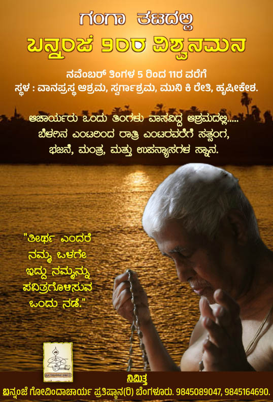 ಹೃಷೀಕೇಶ : ಬನ್ನಂಜೆ ಗೋವಿಂದಾಚಾರ್ಯ ಪ್ರತಿಷ್ಠಾನ (ರಿ.) ಬೆಂಗಳೂರು ಇವರ ವತಿಯಿಂದ ‘ಬನ್ನಂಜೆ 90ರ ವಿಶ್ವನಮನ’ ಸಮಾರಂಭವನ್ನು ದಿನಾಂಕ 05ರಿಂದ 11 ನವೆಂಬರ್ 2025ರಂದು ಹೃಷೀಕೇಶದ ಮುನಿ ಕಿ ರೇತಿ ಸ್ವರ್ಗಾಶ್ರಮ ವಾನಪ್ರಸ್ಥ ಆಶ್ರಮದಲ್ಲಿ ಹಮ್ಮಿಕೊಳ್ಳಲಾಗಿದೆ.