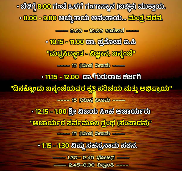 ಪ್ರತಿದಿನ ಬೆಳಿಗ್ಗೆ 08-00 ಗಂಟೆಗೆ ಕಾರ್ಯಕ್ರಮ ಪ್ರಾರಂಭವಾಗಲಿದ್ದು, ಸತ್ಸಂಗ, ಭಜನೆ, ಮಂತ್ರ ಮತ್ತು ಉಪನ್ಯಾಸ ನಡೆಯಲಿದೆ. ಡಾ. ಪ್ರತೋಷ ಏ.ಪಿ. ಇವರಿಂದ ‘ಮಧ್ವಸಿದ್ಧಾಂತ ವಿಜ್ಞಾನ ಬನ್ನಂಜೆ’, ಡಾ. ಗುರುರಾಜ ಕರ್ಜಗಿ ಇವರಿಂದ ದಿನಕ್ಕೊಂದು ಬನ್ನಂಜೆಯವರ ಕೃತಿ ಪರಿಚಯ ಮತ್ತು ಅಭಿಪ್ರಾಯ’, ವಿಜಯ ಸಿಂಹ ಆಚಾರ್ಯರು ‘ಆಚಾರ್ಯರ ಸರ್ವಮೂಲ ಗ್ರಂಥ’, ವಿಷ್ಣು ಸಹಸ್ರನಾಮ ಪಠನ, ಶ್ರೀ ಬ್ರಹ್ಮಣ್ಯಾಚಾರ್ಯರು ‘ಶ್ರೀ ರಾಘವೇಂದ್ರ ತೀರ್ಥ ಗುರುಸಾರ್ವಭೌಮ ವಿರಚಿತ ಶ್ರೀ ರಾಮಚಾರಿತ್ರಮಂಜರೀ’, ಶ್ರೀ ಶ್ರೀ ವಿದ್ಯಾಧೀಶ ತೀರ್ಥರು ಇವರಿಂದ ‘ಶ್ರೀಮದ್ಭಾಗವತ ಪ್ರವಚನ’, ಶ್ರೀಮತಿ ಕವಿತಾ ಉಡುಪ ಮತ್ತು ಶ್ರೀಮತಿ ಸುಮಾ ಶಾಸ್ತ್ರಿಯರಿಂದ ಹಾಡುಗಳ ಭಜನೆ ಹಾಗೂ ದಿನಾಂಕ 11 ನವೆಂಬರ್ 2025ರಂದು 4-00 ಗಂಟೆಗೆ ಶ್ರೀ ವಿದ್ಯಾಭೂಷಣರು ಮತ್ತು ತಂಡದವರಿಂದ ‘ಗೋವಿಂದ ಗಾನ’ ಪ್ರಸ್ತುತಗೊಳ್ಳಲಿದೆ.