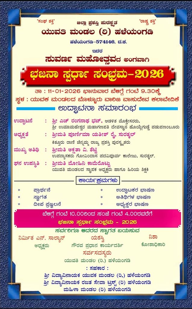 ಹಳೆಯಂಗಡಿ : ಜಿಲ್ಲಾ ಪ್ರಶಸ್ತಿ ಪುರಸ್ಕೃತ ಹಳೆಯಂಗಡಿಯ ಯುವತಿ ಮಂಡಲದ ಸುವರ್ಣ ಮಹೋತ್ಸವದ ಅಂಗವಾಗಿ ಹಳೆಯಂಗಡಿಯ ಶ್ರೀ ವಿದ್ಯಾವಿನಾಯಕ ಯುವಕ ಮಂಡಲ, ಶ್ರೀ ವಿದ್ಯಾವಿನಾಯಕ ರಜತ ಸೇವಾ ಟ್ರಸ್ಟ್ ಹಾಗೂ ಮಹಿಳಾ ಮಂಡಲ ಇವುಗಳ ಸಹಯೋಗದಲ್ಲಿ ‘ಭಜನಾ ಸ್ಪರ್ಧಾ ಸಂಭ್ರಮ-2026’ ಕಾರ್ಯಕ್ರಮವನ್ನು ದಿನಾಂಕ 11 ಜನವರಿ 2026ರಂದು ಬೆಳಿಗ್ಗೆ ಗಂಟೆ 9-30ಕ್ಕೆ ಹಳೆಯಂಗಡಿಯ ಯುವಕ ಮಂಡಲದ ಬೊಳ್ಳೂರು ವಾರಿಜ ವಾಸುದೇವ ಕಲಾವೇದಿಕೆಯಲ್ಲಿ ಹಮ್ಮಿಕೊಳ್ಳಲಾಗಿದೆ.
