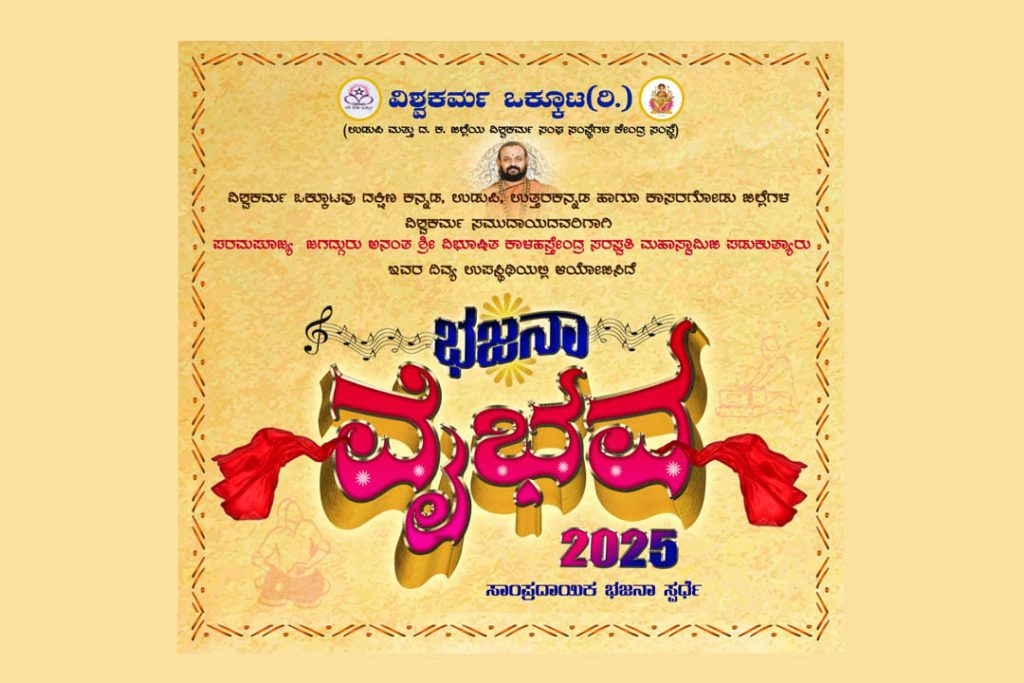 ಕಟಪಾಡಿ : ವಿಶ್ವಕರ್ಮ ಒಕ್ಕೂಟ (ರಿ.) ಇದರ ವತಿಯಿಂದ ದಕ್ಷಿಣ ಕನ್ನಡ, ಉಡುಪಿ, ಉತ್ತರ ಕನ್ನಡ ಮತ್ತು ಕಾಸರಗೋಡು ಜಿಲ್ಲೆಗಳ ವಿಶ್ವಕರ್ಮ ಸಮುದಾಯದವರಿಗಾಗಿ ‘ಭಜನಾ ವೈಭವ 2025’ ಸಾಂಪ್ರದಾಯಿಕ ಭಜನಾ ಸ್ಪರ್ಧೆಯನ್ನು ದಿನಾಂಕ 22 ಜೂನ್ 2025ರಂದು ಬೆಳಗ್ಗೆ 8-30 ಗಂಟೆಗೆ ಕಟಪಾಡಿ ವೇಣುಗಿರಿಯ ಶ್ರೀ ಕಾಳಿಕಾಂಬಾ ವಿಶ್ವಕರ್ಮೇಶ್ವರ ದೇವಸ್ಥಾನದಲ್ಲಿ ಆಯೋಜಿಸಲಾಗಿದೆ.