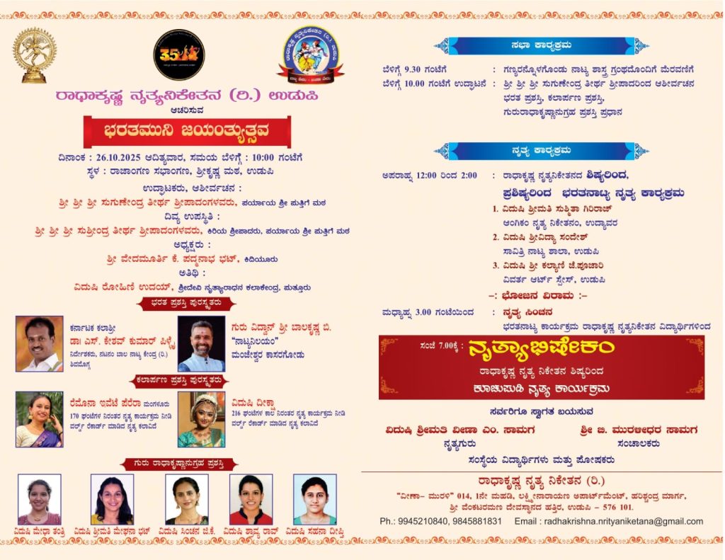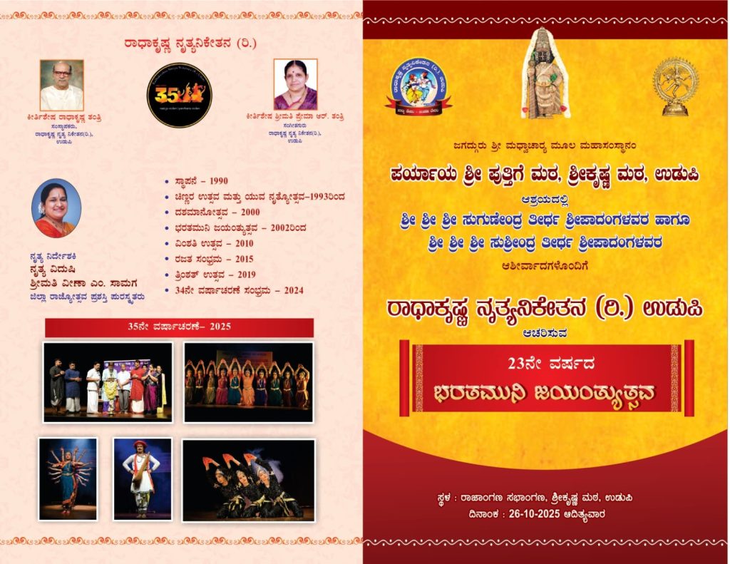 ಉಡುಪಿ : ಪರ್ಯಾಯ ಶ್ರೀ ಪುತ್ತಿಗೆ ಮಠ ಶ್ರೀಕೃಷ್ಣ ಮಠ ಉಡುಪಿ ಆಶ್ರಯದಲ್ಲಿ ರಾಧಾಕೃಷ್ಣ ನೃತ್ಯನಿಕೇತನ (ರಿ.) ಉಡುಪಿ ಆಚರಿಸುವ 23ನೇ ವರ್ಷದ ‘ಭರತಮುನಿ ಜಯಂತ್ಯುತ್ಸವ’ವನ್ನು ದಿನಾಂಕ 26 ಅಕ್ಟೋಬರ್ 2025ರಂದು ಬೆಳಿಗ್ಗೆ 10-00 ಗಂಟೆಗೆ ಉಡುಪಿಯ ಶ್ರೀಕೃಷ್ಣ ಮಠದ ರಾಜಾಂಗಣ ಸಭಾಂಗಣದಲ್ಲಿ ಹಮ್ಮಿಕೊಳ್ಳಲಾಗಿದೆ.