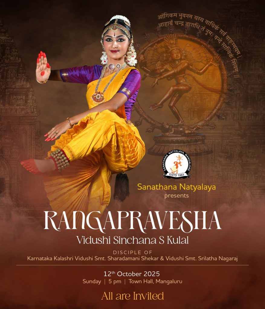 ಮಂಗಳೂರು : ಸನಾತನ ನಾಟ್ಯಾಲಯ ಪ್ರಸ್ತುತ ಪಡಿಸುವ ಗುರು ಶಾರದಾಮಣಿ ಶೇಖರ್ ಮತ್ತು ವಿದುಷಿ ಶ್ರೀಲತಾ ನಾಗರಾಜ್ ಇವರ ಶಿಷ್ಯೆ ವಿದುಷಿ ಸಿಂಚನಾ ಎಸ್. ಕುಲಾಲ್ ಇವರ ‘ಭರತನಾಟ್ಯ ರಂಗಪ್ರವೇಶ’ವು ದಿನಾಂಕ 12 ಅಕ್ಟೋಬರ್ 2025ರಂದು ಸಂಜೆ 5-00ಕ್ಕೆ ಮಂಗಳೂರಿನ ಪುರಭವನದಲ್ಲಿ ನಡೆಯಲಿದೆ.