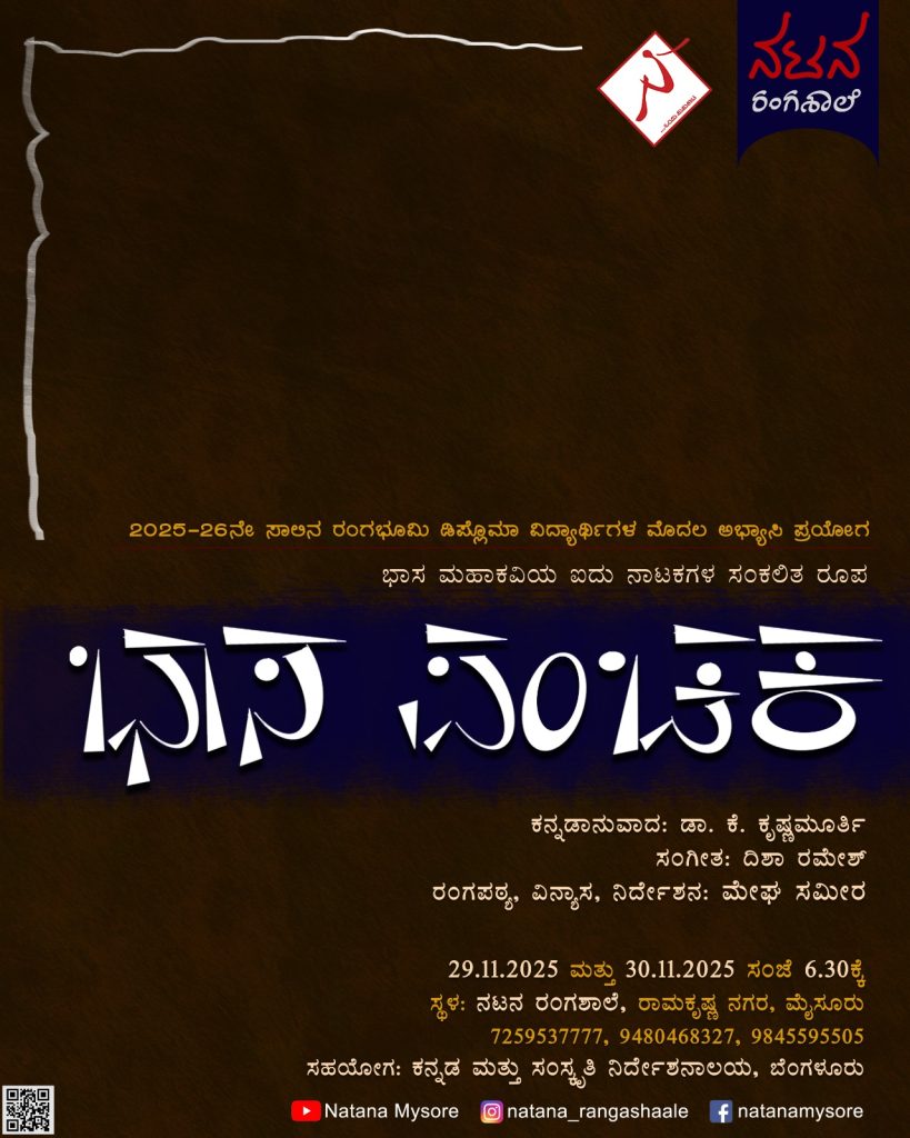 ಮೈಸೂರು : ನಟನ ರಂಗಶಾಲೆಯ ವತಿಯಿಂದ 2025-26ನೇ ಸಾಲಿನ ರಂಗಭೂಮಿ ಡಿಪ್ಲೋಮಾ ವಿದ್ಯಾರ್ಥಿಗಳ ಮೊದಲ ಅಭ್ಯಾಸಿ ಪ್ರಯೋಗ ಭಾಸ ಮಹಾಕವಿಯ ಐದು ನಾಟಕಗಳ ಸಂಕಲಿತ ರೂಪ ‘ಭಾಸ ಪಂಚಕ’ ನಾಟಕ ಪ್ರದರ್ಶನವನ್ನು ದಿನಾಂಕ 29 ಮತ್ತು 30 ನವೆಂಬರ್ 2025ರಂದು ಸಂಜೆ 6-30 ಗಂಟೆಗೆ ಮೈಸೂರಿನ ರಾಮಕೃಷ್ಣ ನಗರ, ನಟನ ರಂಗಶಾಲೆಯಲ್ಲಿ ಹಮ್ಮಿಕೊಳ್ಳಲಾಗಿದೆ.