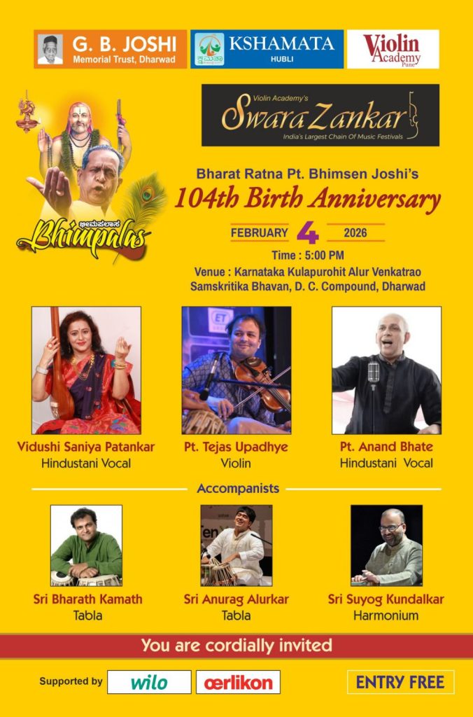 ಭೀಮಪಲಾಸ ಸಂಗೀತೋತ್ಸವದ ಸರಣಿ ಕಾರ್ಯಕ್ರಮದ ಮುಂದಿನ ಭಾಗವಾಗಿ ಈಗ ಜಿ.ಬಿ. ಜೋಶಿ ಮೆಮೋರಿಯಲ್ ಟ್ರಸ್ಟ್ ಪಂಡಿತ್ ಭೀಮಸೇನ ಜೋಶಿಯವರ 104ನೇ ಜನ್ಮದಿನದ ಅಂಗವಾಗಿ ದಿನಾಂಕ 04 ಫೆಬ್ರುವರಿ 2026ರಂದು ಸಂಜೆ 5-00 ಗಂಟೆಗೆ ಧಾರವಾಡದ ಆಲೂರು ವೆಂಕಟರಾವ್ ಸಾಂಸ್ಕೃತಿಕ ಭವನದಲ್ಲಿ ‘ಸ್ವರ ಝಂಕಾರ’ ಕಾರ್ಯಕ್ರಮವನ್ನು ಆಯೋಜಿಸಿದ್ದು, ಗಾಯನ-ವಾದನಗಳ ನಿನಾದ ಹರಿದುಬರಲಿದೆ. ಇದಕ್ಕೆ ಕೇಂದ್ರ ಸಚಿವ ಪ್ರಹ್ಲಾದ ಜೋಶಿಯವರ ಕ್ಷಮತಾ ಸಂಸ್ಥೆ ಹಾಗೂ ಪುಣೆಯ ವಯೋಲಿನ್ ಅಕಾಡೆಮಿ ಕೈಜೋಡಿಸಿವೆ.