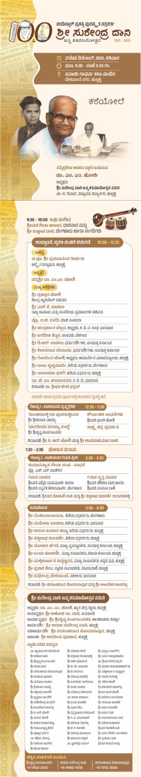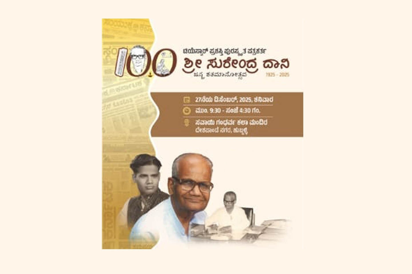 ಹುಬ್ಬಳ್ಳಿ : ಟಿಯೆಸ್ಸಾರ್ ಪ್ರಶಸ್ತಿ ಪುರಸ್ಕೃತ ಪತ್ರಕರ್ತ ಶ್ರೀ ಸುರೇಂದ್ರ ದಾನಿ ಇವರ ಜನ್ಮ ಶತಮನೋತ್ಸವ ಕಾರ್ಯಕ್ರಮವನ್ನು ದಿನಾಂಕ 27 ಡಿಸೆಂಬರ್ 2025ರಂದು ಮುಂಜಾನೆ 9-30 ಗಂಟೆಗೆ ಹುಬ್ಬಳ್ಳಿ ದೇಶಪಾಂಡೆ ನಗರ ಸವಾಯಿ ಗಂಧರ್ವ ಕಲಾ ಮಂದಿರದಲ್ಲಿ ಹಮ್ಮಿಕೊಳ್ಳಲಾಗಿದೆ.