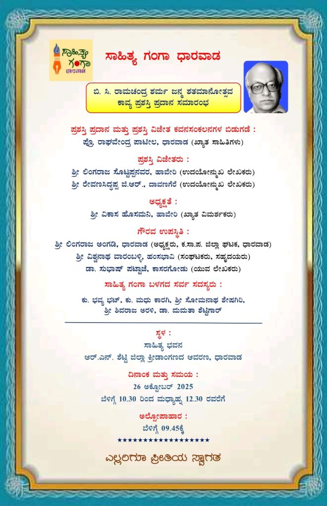 ಧಾರವಾಡ : ಸಾಹಿತ್ಯ ಗಂಗಾ ಧಾರವಾಡ ಸಂಸ್ಥೆಯ ವತಿಯಿಂದ ಬಿ.ಸಿ. ರಾಮಚಂದ್ರ ಶರ್ಮ ಜನ್ಮ ಶತಮಾನೋತ್ಸವ ಕಾವ್ಯ ಪ್ರಶಸ್ತಿ ಪ್ರದಾನ ಸಮಾರಂಭವನ್ನು ದಿನಾಂಕ 26 ಅಕ್ಟೋಬರ್ 2025ರಂದು ಬೆಳಗ್ಗೆ 10-30 ಗಂಟೆಗೆ ಧಾರವಾಡದ ಆರ್.ಎನ್. ಶೆಟ್ಟಿ ಜಿಲ್ಲಾ ಕ್ರೀಡಾಂಗಣದ ಸಾಹಿತ್ಯ ಭವನದಲ್ಲಿ ಆಯೋಜಿಸಲಾಗಿದೆ.