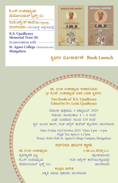 ಮಂಗಳೂರು : ಕೆ.ಎಸ್. ಉಪಾಧ್ಯಾಯ ಮೆಮೋರಿಯಲ್ ಟ್ರಸ್ಟ್ (ರಿ.) ಮತ್ತು ಸಂತ ಆಗ್ನೇಸ್ ಕಾಲೇಜು (ಸ್ವಾಯತ್ತ) ಮಂಗಳೂರು ಇವರ ಸಂಯುಕ್ತ ಆಶ್ರಯದಲ್ಲಿ ಕೃತಿಗಳ ಲೋಕಾರ್ಪಣೆ ಸಮಾರಂಭವನ್ನು ದಿನಾಂಕ 03 ಅಕ್ಟೋಬರ್ 2025ರಂದು ಸಂಜೆ 4-00 ಗಂಟೆಗೆ ಮಂಗಳೂರು ಸಂತ ಆಗ್ನೇಸ್ ಕಾಲೇಜು ಕ್ಯಾಂಪಸ್ ‘ಅವಿಲಾ ಹಾಲ್’ನಲ್ಲಿ ಹಮ್ಮಿಕೊಳ್ಳಲಾಗಿದೆ. ಡಾ. ಲೀಲಾ ಉಪಾಧ್ಯಾಯ ಸಂಪಾದಿಸಿರುವ ಶ್ರೀ ಕೆ.ಎಸ್. ಉಪಾಧ್ಯಾಯ ಅವರ ಎರಡು ಕೃತಿಗಳು ಲೋಕಾರ್ಪಣೆಗೊಳ್ಳಲಿವೆ.