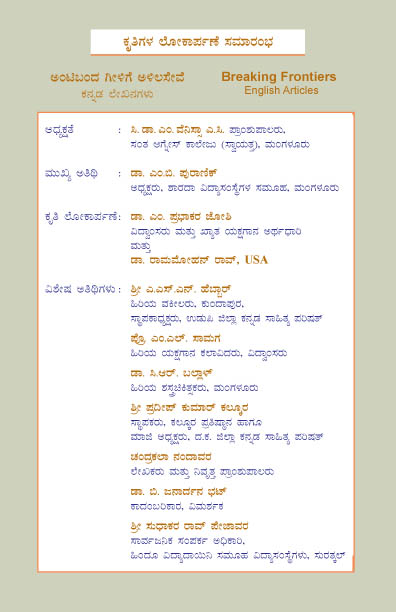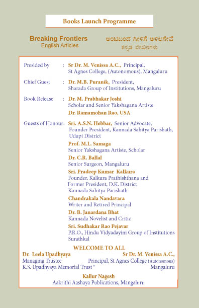 ಈ ಸಮಾರಂಭದ ಅಧ್ಯಕ್ಷತೆಯನ್ನು ಸಂತ ಆಗ್ನೇಸ್ ಕಾಲೇಜಿನ ಪ್ರಾಂಶು ಪಾಲರಾದ ಸಿ.ಡಾ.ಎಂ. ವೆನಿಸ್ಸಾ ಎ.ಸಿ. ಇವರು ವಹಿಸಲಿದ್ದು, ಶಾರದಾ ವಿದ್ಯಾ ಸಂಸ್ಥೆಗಳ ಅಧ್ಯಕ್ಷರಾದ ಡಾ. ಎಂ.ಬಿ. ಪುರಾಣಿಕ್ ಇವರು ಮುಖ್ಯ ಅತಿಥಿಗಳಾಗಿ ಭಾಗವಹಿಸಲಿದ್ದಾರೆ. ವಿದ್ವಾಂಸರು ಮತ್ತು ಖ್ಯಾತ ಯಕ್ಷಗಾನ ಅರ್ಥಧಾರಿ ಡಾ. ಎಂ. ಪ್ರಭಾಕರ ಜೋಶಿ ಮತ್ತು ಡಾ. ರಾಮಮೋಹನ್ ರಾವ್ ಇವರು ಕೃತಿ ಲೋಕಾರ್ಪಣೆ ಮಾಡಲಿದ್ದಾರೆ. ಹಿರಿಯ ವಕೀಲರು ಉಡುಪಿ ಜಿಲ್ಲಾ ಕನ್ನಡ ಸಾಹಿತ್ಯ ಪರಿಷತ್ ಸ್ಥಾಪಕಾಧ್ಯಕ್ಷರಾದ ಶ್ರೀ ಎ.ಎಸ್.ಎನ್. ಹೆಬ್ಬಾರ್, ಹಿರಿಯ ಯಕ್ಷಗಾನ ಕಲಾವಿದರು ಮತ್ತು ವಿದ್ವಾಂಸರಾದ ಪ್ರೊ. ಎಂ.ಎಲ್. ಸಾಮಗ, ಮಂಗಳೂರಿನ ಹಿರಿಯ ಶಸ್ತ್ರಚಿಕಿತ್ಸಕರಾದ ಡಾ. ಸಿ.ಆರ್. ಬಲ್ಲಾಳ್, ಕಲ್ಕೂರ ಪ್ರತಿಷ್ಠಾನ ಸ್ಥಾಪಕರು ಹಾಗೂ ದ.ಕ. ಜಿಲ್ಲಾ ಕನ್ನಡ ಸಾಹಿತ್ಯ ಪರಿಷತ್ ಮಾಜಿ ಅಧ್ಯಕ್ಷರಾದ ಶ್ರೀ ಪ್ರದೀಪ್ ಕುಮಾರ್ ಕಲ್ಕೂರ, ಲೇಖಕರು ಮತ್ತು ನಿವೃತ್ತ ಪ್ರಾಂಶುಪಾಲರು ಚಂದ್ರಕಲಾ ನಂದಾವರ, ಕಾದಂಬರಿಕಾರ ವಿಮರ್ಶಕರಾದ ಡಾ. ಬಿ. ಜನಾರ್ದನ ಭಟ್, ಸುರತ್ಕಲ್ ಹಿಂದೂ ವಿದ್ಯಾದಾಯಿನಿ ಸಮೂಹ ವಿದ್ಯಾಸಂಸ್ಥೆಗಳ ಸಾರ್ವಜನಿಕ ಸಂಪರ್ಕ ಅಧಿಕಾರಿ ಶ್ರೀ ಸುಧಾಕರ ರಾವ್ ಪೇಜಾವರ ಇವರುಗಳು ವಿಶೇಷ ಅತಿಥಿಗಳಾಗಿ ಭಾಗವಹಿಸಲಿದ್ದಾರೆ.