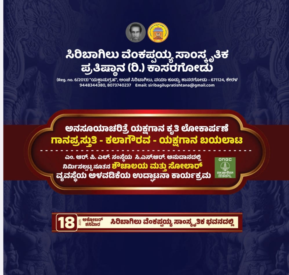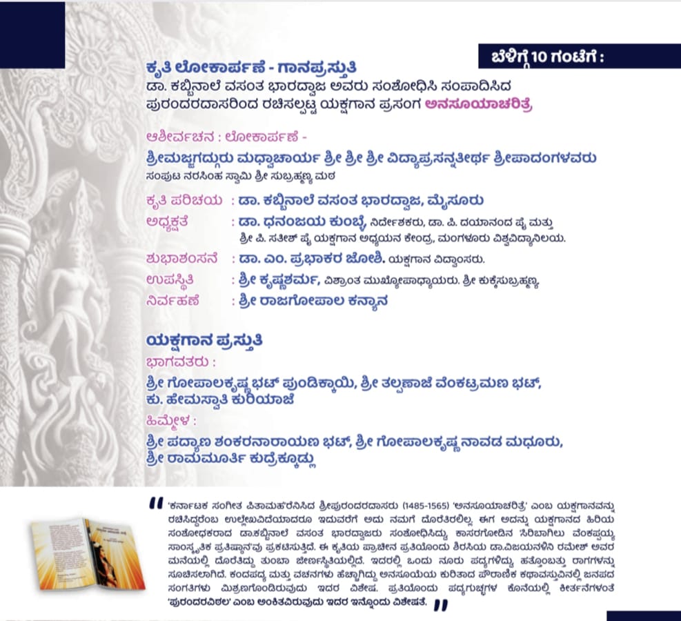ಕಾಸರಗೋಡು : ಸಿರಿಬಾಗಿಲು ಪ್ರತಿಷ್ಠಾನದ ಪ್ರಕಾಶನದಲ್ಲಿ ಕರ್ನಾಟಕ ಸಂಗೀತ ಪಿತಾಮಹರೆನಿಸಿದ ಶ್ರೀ ಪುರಂದರದಾಸರು ರಚಿಸಿದ ಯಕ್ಷಗಾನ ಪ್ರಸಂಗ ವಿಶೇಷ ಕೃತಿ ಅನಸೂಯಾ ಚರಿತ್ರೆ” ಇದರ ಲೋಕರ್ಪಣಾ ಸಮಾರಂಭವು ದಿನಾಂಕ 18 ಅಕ್ಟೋಬರ್ 2025ರ ಶನಿವಾರದಂದು ಬೆಳಗ್ಗೆ ಘಂಟೆ 10.00ಕ್ಕೆ ಕಾಸರಗೋಡಿನ ಸಿರಿಬಾಗಿಲಿನಲ್ಲಿರುವ ವೆಂಕಪ್ಪಯ್ಯ ಸಾಂಸ್ಕೃತಿಕ ಭವನದಲ್ಲಿ ನಡೆಯಲಿದೆ.