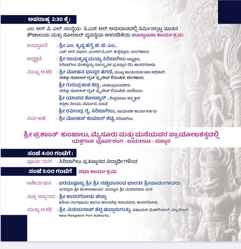 ಸಮಾರಂಭದಲ್ಲಿ ಶ್ರೀ ಧರ್ಮಸ್ಥಳ ಮೇಳದಲ್ಲಿ ಸತತ 50 ವರ್ಷಗಳ ನಿರಂತರ ಯಕ್ಷಗಾನ ಸೇವೆ ಮಾಡುತ್ತಿರುವ ಹಿರಿಯ ಕಲಾವಿದರಾದ ಶ್ರೀ ವಸಂತಗೌಡ ಕಾಯರ್ತಡ್ಕ ಇವರಿಗೆ ಸನ್ಮಾನ ಹಾಗೂ ಶ್ರೀ ಮಾಧವ ಪಾಟಾಳಿ ನೀರ್ಚಾಲು ಇವರಿಗೆ ಕಲಾ ಗೌರವ ನಡೆಯಲಿದೆ. ತೆಂಕುತಿಟ್ಟಿನ ಹಿರಿಯ ಕಲಾವಿದರ ಕೂಡುವಿಕೆಯಿಂದ ಸಂಜೆ 6:00 ಗಂಟೆಯಿಂದ ಕವಿ ಸೀತಾನದಿ ಗಣಪಯ್ಯ ಶೆಟ್ಟಿ ವಿರಚಿತ “ಶನೀಶ್ವರ ಮಹಾತ್ಮೆ” ಎಂಬ ಯಕ್ಷಗಾನ ಬಯಲಾಟವು ನಡೆಯಲಿದೆ. ಇಡೀ ದಿನ ನಡೆಯುವ ಈ ಕಾರ್ಯಕ್ರಮಕ್ಕೆ ಕಲಾ ಬಂಧುಗಳು ಹೆಚ್ಚಿನ ರೀತಿಯಲ್ಲಿ ಭಾಗವಹಿಸಿ ಸಹಕರಿಸಬೇಕೆಂದು ಸಿರಿಬಾಗಿಲು ಪ್ರತಿಷ್ಠಾನವು ತಿಳಿಸಿದೆ.