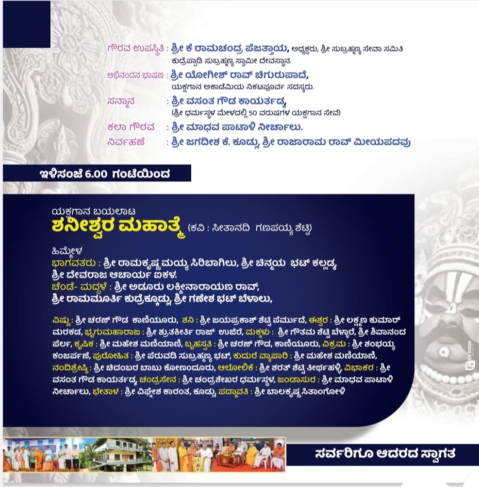 ಸಂಜೆ 4 ಗಂಟೆಗೆ ಸರಿಯಾಗಿ ಶ್ರೀ ಪ್ರಶಾಂತ್ ಕುಂಜಾಲು ಮೈಸೂರು ಮತ್ತು ಮನೆಯವರ ಪ್ರಾಯೋಜಕತ್ವದಲ್ಲಿ “ಯಕ್ಷಗಾನ ಪೂರ್ವ ರಂಗ- ಬಯಲಾಟ- ಸನ್ಮಾನ” ನಡೆಯಲಿದೆ .ನಾಲ್ಕು ಗಂಟೆಗೆ ಸಿರಿಬಾಗಿಲು ಪ್ರತಿಷ್ಠಾನದ ವಿದ್ಯಾರ್ಥಿಗಳಿಂದ ಪೂರ್ವರಂಗ, ಬಳಿಕ ಪರಮಪೂಜ್ಯ ಶ್ರೀ ಶ್ರೀ ಸಚ್ಚಿದಾನಂದ ಭಾರತೀ ಶ್ರೀಪಾದಂಗಳವರು ,ಜಗದ್ಗುರು ಶ್ರೀ ಶಂಕರಾಚಾರ್ಯ ಸಂಸ್ಥಾನಂ ಶ್ರೀಮದ್ ಎಡನೀರು ಮಠ ಇವರ ಆಶೀರ್ವಚನದಲ್ಲಿ ನಡೆಯುವ ಸಭಾ ಕಾರ್ಯಕ್ರಮದಲ್ಲಿ, ಕಾಸರಗೋಡಿನ ಹಿರಿಯರಂಗಭೂಮಿ ಹಾಗೂ ಚಲನಚಿತ್ರ ಕಲಾವಿದರಾದ ಶ್ರೀ ಕಾಸರಗೋಡು ಚಿನ್ನ, ಎನ್. ಎಂ. ಪಿ. ಎ. ಪಣಂಬೂರು ಇದರ ಸಹಾಯಕ ಮೆಟೀರಿಯಲ್ ಮ್ಯಾನೇಜರ್ ಆಗಿರುವ ಶ್ರೀ ವಿನಯರಾಜ ಶೆಟ್ಟಿ ಚಿಪ್ಪಾರುಗುತ್ತು, ಕುದ್ರಪ್ಪಾಡಿ ಶ್ರೀ ಸುಬ್ರಹ್ಮಣ್ಯ ದೇವಸ್ಥಾನದ ಸುಬ್ರಹ್ಮಣ್ಯ ಸೇವಾ ಸಮಿತಿಯ ಅಧ್ಯಕ್ಷರಾದ ಶ್ರೀ ಕೆ. ರಾಮಚಂದ್ರ ಪೆಜತ್ತಾಯ ಮುಖ್ಯ ಅತಿಥಿಗಳಾಗಿ ಭಾಗವಹಿಸಲಿದ್ದಾರೆ.