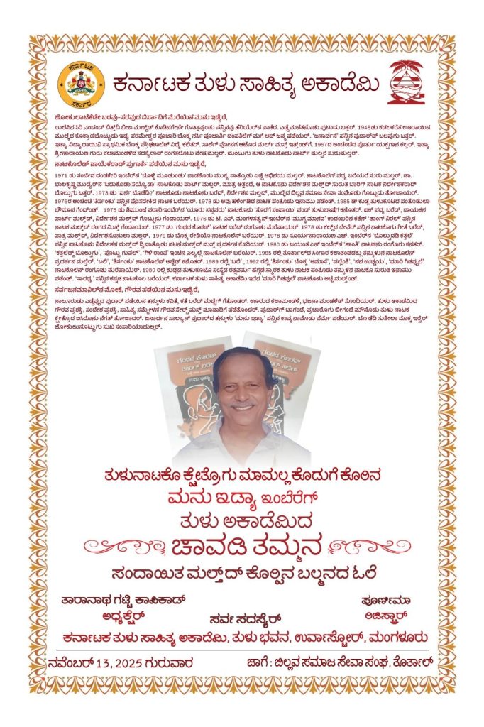 ಸುರತ್ಕಲ್ : ಕರ್ನಾಟಕ ತುಳು ಸಾಹಿತ್ಯ ಅಕಾಡೆಮಿ ಮತ್ತು ಬಿಲ್ಲವ ಸಮಾಜ ಸೇವಾ ಸಂಘ (ರಿ.) ಇಡ್ಯಾ ಸುರತ್ಕಲ್ ಇವರ ವತಿಯಿಂದ ಮನು ಇಡ್ಯಾ ಇವರ ‘ಗಂಧದ ಕೊರಡ್’ ಮತ್ತು ‘ತಾಂಗ್ ನಿರೆಲ್’ ಎರಡು ನಾಟಕಗಳ ಪುಸ್ತಕ ಬಿಡುಗಡೆ ಮತ್ತು ಚಾವಡಿ ತಮ್ಮನ ಕಾರ್ಯಕ್ರಮವನ್ನು ದಿನಾಂಕ 13 ನವೆಂಬರ್ 2025ರಂದು ಸಂಜೆ 4-00 ಗಂಟೆಗೆ ಸುರತ್ಕಲ್ ಇಡ್ಯಾ ಬಿಲ್ಲವ ಸಮಾಜ ಸೇವಾ ಸಂಘದಲ್ಲಿ ಹಮ್ಮಿಕೊಳ್ಳಲಾಗಿದೆ.