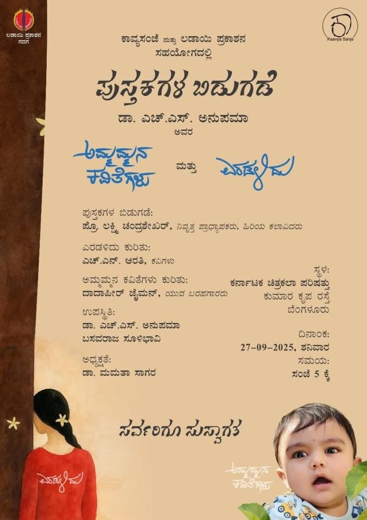 ಬೆಂಗಳೂರು : ಕಾವ್ಯ ಸಂಜೆ ಮತ್ತು ಲಡಾಯಿ ಪ್ರಕಾಶನ ಇವುಗಳ ಸಹಯೋಗದಲ್ಲಿ ಡಾ. ಎಚ್.ಎಸ್. ಅನುಪಮಾ ಇವರ ಪುಸ್ತಕಗಳ ಬಿಡುಗಡೆ ಕಾರ್ಯಕ್ರಮವನ್ನು ದಿನಾಂಕ 27 ಸೆಪ್ಟೆಂಬರ್ 2025ರಂದು ಸಂಜೆ 5-00 ಗಂಟೆಗೆ ಬೆಂಗಳೂರಿನ ಕುಮಾರ ಕೃಪ ರಸ್ತೆಯಲ್ಲಿರುವ ಕರ್ನಾಟಕ ಚಿತ್ರಕಲಾ ಪರಿಷತ್ತಿನಲ್ಲಿ ಹಮ್ಮಿಕೊಳ್ಳಲಾಗಿದೆ.