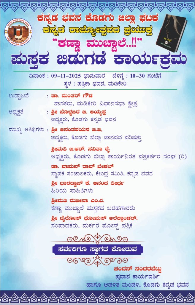 ಮಡಿಕೇರಿ : ಕನ್ನಡ ಭವನ ಕೊಡಗು ಜಿಲ್ಲಾ ಘಟಕ ಇವರ ವತಿಯಿಂದ ಕನ್ನಡ ರಾಜ್ಯೋತ್ಸವ ಪ್ರಯುಕ್ತ ‘ಕಣ್ಣಾ ಮುಚ್ಚಾಲೆ..!!’ ಪುಸ್ತಕ ಬಿಡುಗಡೆ ಕಾರ್ಯಕ್ರಮವನ್ನು ದಿನಾಂಕ 09 ನವೆಂಬರ್ 2025ರಂದು ಬೆಳಿಗ್ಗೆ 10-30 ಗಂಟೆಗೆ ಮಡಿಕೇರಿ ಪತ್ರಿಕಾ ಭವನದಲ್ಲಿ ಹಮ್ಮಿಕೊಳ್ಳಲಾಗಿದೆ.