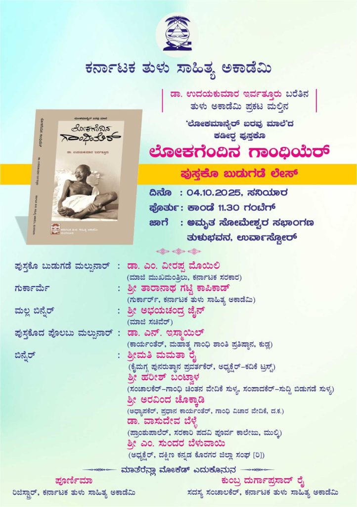 ಮಂಗಳೂರು : ಕರ್ನಾಟಕ ತುಳು ಸಾಹಿತ್ಯ ಅಕಾಡೆಮಿ ಇವರ ವತಿಯಿಂದ ಡಾ. ಉದಯ ಕುಮಾರ ಇರ್ವತ್ತೂರು ಇವರು ರಚಿಸಿದ ‘ಲೋಕಗೆಂದಿನ ಗಾಂಧಿಯೆರ್’ ಪುಸ್ತಕ ಬಿಡುಗಡೆ ಕಾರ್ಯಕ್ರಮವನ್ನು ದಿನಾಂಕ 04 ಅಕ್ಟೋಬರ್ 2025ರಂದು ಬೆಳಿಗ್ಗೆ 11-30 ಗಂಟೆಗೆ ಮಂಗಳೂರಿನ ಉರ್ವಸ್ಟೋರ್ ತುಳುಭವನದ ಅಮೃತ ಸೋಮೇಶ್ವರ ಸಭಾಂಗಣದಲ್ಲಿ ಹಮ್ಮಿಕೊಳ್ಳಲಾಗಿದೆ.