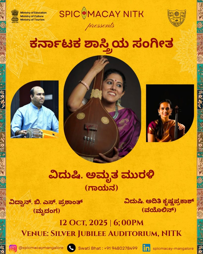 ಮಂಗಳೂರು : ಸ್ಪೀಕ್ ಮಕೇ ಎನ್.ಐ.ಟಿ.ಕೆ. ಇವರು ಪ್ರಸ್ತುತ ಪಡಿಸುವ ‘ಕರ್ನಾಟಕ ಶಾಸ್ತ್ರೀಯ ಸಂಗೀತ’ ಕಾರ್ಯಕ್ರಮವನ್ನು ದಿನಾಂಕ 12 ಅಕ್ಟೋಬರ್ 2025ರಂದು ಸಂಜೆ 6-00 ಗಂಟೆಗೆ ಎನ್.ಐ.ಟಿ.ಕೆ.ಯ ಸಿಲ್ವರ್ ಜುಬಿಲಿ ಸಭಾಂಗಣದಲ್ಲಿ ಆಯೋಜಿಸಲಾಗಿದೆ. ವಿದುಷಿ ಅಮೃತ ಮುರಳಿ ಇವರ ಹಾಡುಗಾರಿಕೆಗೆ ವಿದ್ವಾನ್ ಬಿ.ಎಸ್. ಪ್ರಶಾಂತ್ ಇವರು ಮೃದಂಗದಲ್ಲಿ ಹಾಗೂ ವಿದುಷಿ ಅದಿತಿ ಕೃಷ್ಣಪ್ರಕಾಶ್ ಇವರು ವಯೋಲಿನ್ ನಲ್ಲಿ ಸಾಥ್ ನೀಡಲಿದ್ದಾರೆ.