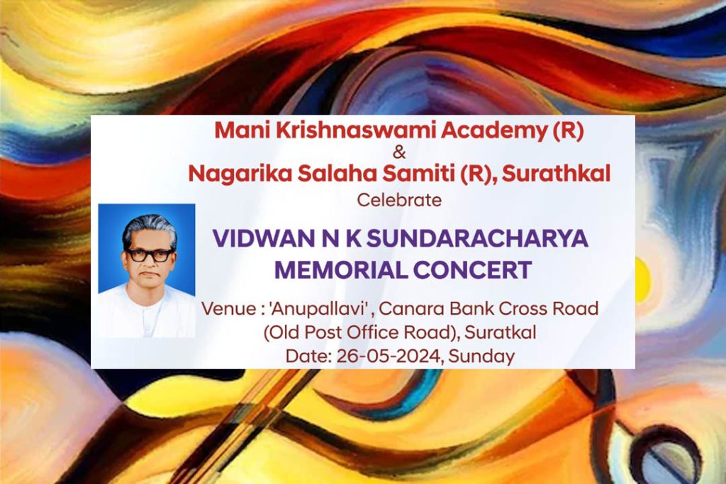 ಸುರತ್ಕಲ್ : ಮಣಿ ಕೃಷ್ಣಸ್ವಾಮಿ ಅಕಾಡೆಮಿ ಮತ್ತು ಸುರತ್ಕಲ್ ನಾಗರಿಕ ಸಲಹಾ ಸಮಿತಿ ಸಂಸ್ಥೆಗಳ ಆಶ್ರಯದಲ್ಲಿ ಹಿರಿಯ ಸಂಗೀತಗಾರ ವಿದ್ವಾನ್ ಎನ್.ಕೆ. ಸುಂದರಾಚಾರ್ಯ ಸಂಸ್ಮರಣಾ ಸಂಗೀತ ಕಛೇರಿಯು ದಿನಾಂಕ 26-05-2024ರಂದು ಸಂಜೆ ಗಂಟೆ 5-00ಕ್ಕೆ ಸುರತ್ಕಲ್ನ ‘ಅನುಪಲ್ಲವಿ’ಯಲ್ಲಿ ನಡೆಯಲಿದೆ.