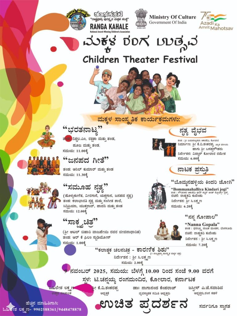 ಕೋಲಾರ : ರಾಷ್ಟ್ರಪ್ರಶಸ್ತಿ ಪುರಸ್ಕೃತ ಮಕ್ಕಳ ಸಂಸ್ಥೆ ‘ರಂಗಕಹಳೆ’ ಬೆಂಗಳೂರು ಇದರ ವತಿಯಿಂದ ಕನ್ನಡ ಮತ್ತು ಸಂಸ್ಕೃತಿ ಇಲಾಖೆ ಬೆಂಗಳೂರು ಇವರ ಸಹಯೋಗದೊಂದಿಗೆ ‘ಮಕ್ಕಳ ರಂಗ ಉತ್ಸವ’ವನ್ನು ದಿನಾಂಕ 09 ನವೆಂಬರ್ 2025ರಂದು ಬೆಳಗ್ಗೆ 10-00 ಗಂಟೆಗೆ ಕೋಲಾರದ ಟಿ. ಚನ್ನಯ್ಯ ರಂಗಮಂದಿರದಲ್ಲಿ ಹಮ್ಮಿಕೊಳ್ಳಲಾಗಿದೆ.