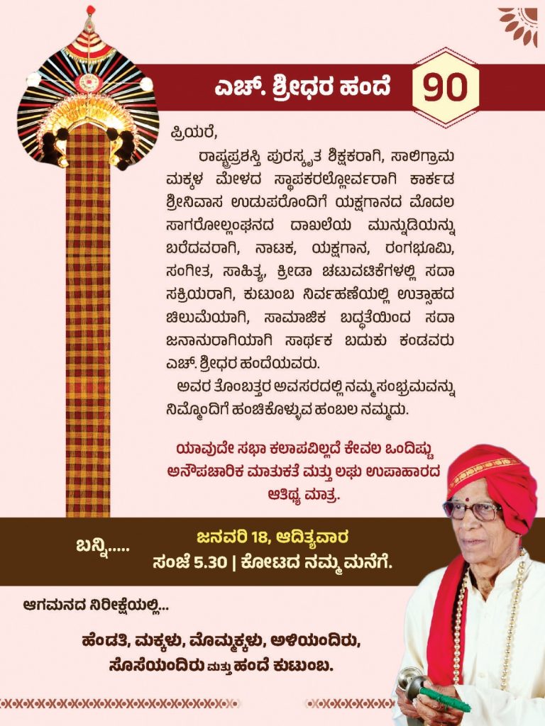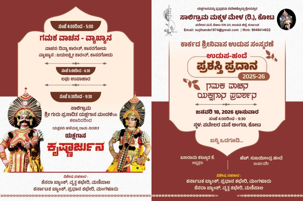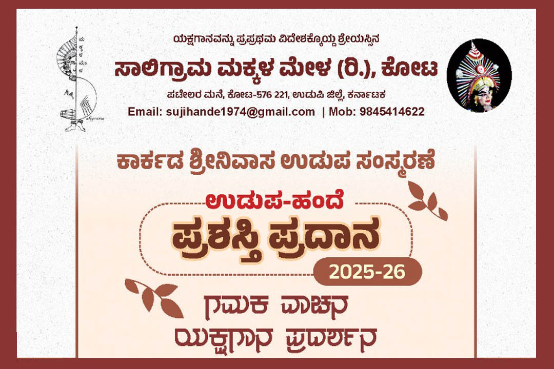 ಕೋಟ : ಸಾಲಿಗ್ರಾಮ ಮಕ್ಕಳ ಮೇಳ (ರಿ.) ಕೋಟ ಇದರ ವತಿಯಿಂದ ಕಾರ್ಕಡ ಶ್ರೀನಿವಾಸ ಉಡುಪ ಸಂಸ್ಮರಣೆ ಮತ್ತು ಉಡುಪ ಹಂದೆ ಪ್ರಶಸ್ತಿ ಪ್ರದಾನ ಸಮಾರಂಭವನ್ನು ದಿನಾಂಕ 18 ಜನವರಿ 2026ರಂದು ಸಂಜೆ 4-00 ಗಂಟೆಗೆ ಕೋಟ ಪಟೇಲರ ಮನೆ ಅಂಗಣದಲ್ಲಿ ಆಯೋಜಿಸಲಾಗಿದೆ.