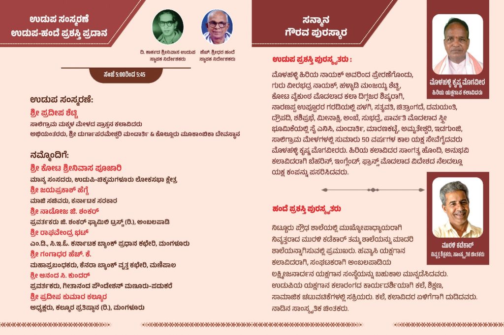 4-00 ಗಂಟೆಗೆ ನಡೆಯಲಿರುವ ಗಮಕ ವಾಚನ – ವ್ಯಾಖ್ಯಾನದಲ್ಲಿ ಕಾಸರಗೋಡಿನ ದಿವ್ಯಾ ಕಾರಂತ್ ವಾಚನ ಹಾಗೂ ಜಯಲಕ್ಷ್ಮೀ ಕಾರಂತ್ ವ್ಯಾಖ್ಯಾನ ನೀಡಲಿದ್ದಾರೆ. 5-00 ಗಂಟೆಗೆ ಸಾಲಿಗ್ರಾಮ ಮಕ್ಕಳ ಮೇಳದ ಪ್ರಾಕ್ತನ ಕಲಾವಿದರಾದ ಪ್ರದೀಪ ಶೆಟ್ಟಿ ಇವರಿಂದ ಉಡುಪ ಸಂಸ್ಮರಣೆ ನಡೆಯಲಿದೆ. ಇದೇ ಸಂದರ್ಭದಲ್ಲಿ ಹಿರಿಯ ಯಕ್ಷಗಾನ ಕಲಾವಿದ ಮೊಳಹಳ್ಳಿ ಕೃಷ್ಣ ಮೊಗವೀರ ಇವರಿಗೆ ‘ಉಡುಪ ಪ್ರಶಸ್ತಿ’ ಮತ್ತು ನಿವೃತ್ತ ಶಿಕ್ಷಕ ಸಾಂಸ್ಕೃತಿಕ ಚಿಂತಕರಾದ ಮುರಳಿ ಕಡೆಕಾರ್ ಇವರಿಗೆ ‘ಹಂದೆ ಪ್ರಶಸ್ತಿ’ ಪ್ರದಾನ ಮಾಡಿ ಗೌರವಿಸಲಾಗುವುದು. 6-30 ಗಂಟೆಗೆ ಸಾಲಿಗ್ರಾಮ ಶ್ರೀ ಗುರು ಪ್ರಸಾದಿತ ಯಕ್ಷಗಾನ ಮಂಡಳಿಯ ಕಲಾವಿದರಿಂದ ಯಕ್ಷಕವಿ ಹಳೆಮಕ್ಕಿ ರಾಮ ವಿರಚಿತ ‘ಕೃಷ್ಣಾರ್ಜುನ’ ಯಕ್ಷಗಾನ ಪ್ರದರ್ಶನಗೊಳ್ಳಲಿದೆ.