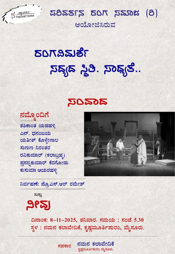 ಮೈಸೂರು : ಪರಿವರ್ತನ ರಂಗ ಸಮಾಜ (ರಿ.) ಮೈಸೂರು ಆಯೋಜಿಸಿರುವ ‘ರಂಗವಿಮರ್ಶೆ ಸದ್ಯದ ಸ್ಥಿತಿ ಸಾಧ್ಯತೆ’ ಎಂಬ ವಿಷಯದ ಬಗ್ಗೆ ಸಂವಾದ ಕಾರ್ಯಕ್ರಮವು ದಿನಾಂಕ 08 ನವೆಂಬರ್ 2025ರಂದು ಸಂಜೆ 5-30 ಗಂಟೆಗೆ ಮೈಸೂರಿನ ಕೃಷ್ಣಮೂರ್ತಿಪುರಂ ಇಲ್ಲಿರುವ ನಮನ ಕಲಾವೇದಿಕೆಯಲ್ಲಿ ನಡೆಯಲಿದೆ.