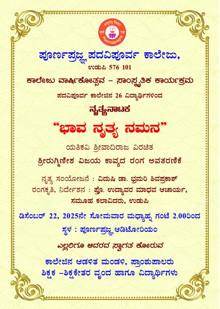 ಉಡುಪಿ : ಕಾಲೇಜು ವಿದ್ಯಾರ್ಥಿಗಳಲ್ಲಿ ಶಾಸ್ತ್ರೀಯ ಕಲೆಯ ಬಗೆಗಿನ ಸಂವೇದನೆಯನ್ನು ಮೂಡಿಸುವಂಥ ಕಲಾಚಟುವಟಿಕೆಗಳನ್ನು ನಿರಂತರವಾಗಿ ಪ್ರೋತ್ಸಾಹಿಸಿಕೊಂಡು ಬರುತ್ತಿರುವ ಉಡುಪಿಯ ಪೂರ್ಣಪ್ರಜ್ಞ ಪದವಿಪೂರ್ವ ಕಾಲೇಜಿನ ಈ ಬಾರಿಯ ವಾರ್ಷಿಕೋತ್ಸವದಲ್ಲಿ ಸುಮಾರು 26 ಮಂದಿ ವಿದ್ಯಾರ್ಥಿನಿಯರು ಯತಿಕವಿ ಶ್ರೀವಾದಿರಾಜ ವಿರಚಿತ ಶ್ರೀರುಗ್ಮಿಣೀಶ ವಿಜಯ ಎಂಬ ಸಂಸ್ಕೃತಕಾವ್ಯವನ್ನು ಆಧರಿಸಿದ ‘ಭಾವ ನೃತ್ಯ ನಮನ’ ಎಂಬ ನೃತ್ಯನಾಟಕವನ್ನು ದಿನಾಂಕ 22 ಡಿಸೆಂಬರ್ 2025ರಂದು ಮಧ್ಯಾಹ್ನ 2-00 ಗಂಟೆಗೆ ಪೂರ್ಣಪ್ರಜ್ಞ ಆಡಿಟೋರಿಯಂನಲ್ಲಿ ಪ್ರಸ್ತುತಪಡಿಸಲಿದ್ದಾರೆ.