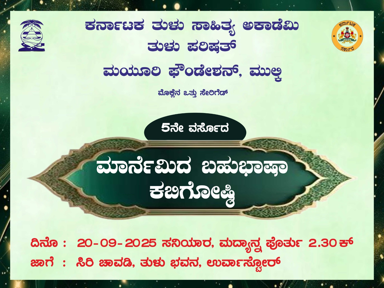 ಮಂಗಳೂರು : ಕರ್ನಾಟಕ ತುಳು ಸಾಹಿತ್ಯ ಅಕಾಡೆಮಿ, ತುಳು ಪರಿಷತ್ ಹಾಗೂ ಮಯೂರಿ ಫೌಂಡೇಶನ್ ಜಂಟಿಯಾಗಿ ಆಯೋಜಿಸುವ ಐದನೇ ವರ್ಷದ ದಸರಾ ಬಹುಭಾಷಾ ಕವಿಗೋಷ್ಠಿಯು ದಿನಾಂಕ 20 ಸೆಪ್ಟೆಂಬರ್ 2025 ರಂದು ಮಧ್ಯಾಹ್ನ ಘಂಟೆ 2.30ಕ್ಕೆ ಮಂಗಳೂರಿನ ಉರ್ವಾಸ್ಟೋರ್ನಲ್ಲಿರುವ ತುಳು ಸಾಹಿತ್ಯ ಅಕಾಡೆಮಿಯ ತುಳುಭವನದಲ್ಲಿ ನಡೆಯಲಿದೆ.